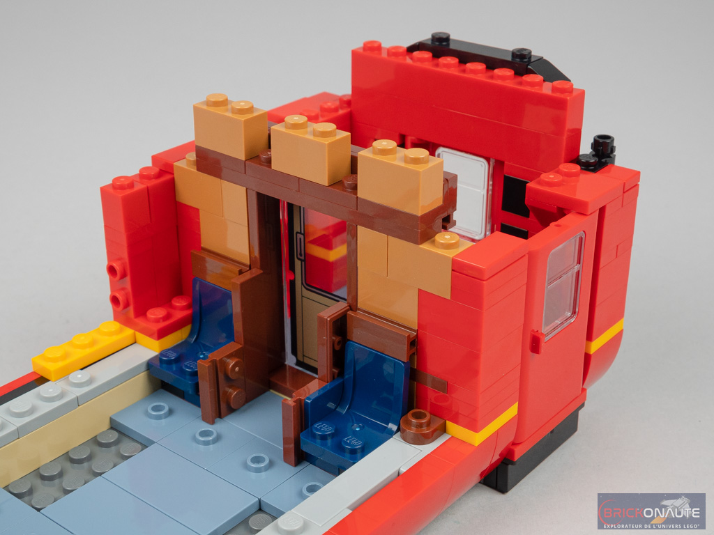 On pourra se poser la question du choix du rouge « pompiers » pour l’ensemble, qui apparaît plus sombre à l’écran. La volonté d’utiliser des pièces existantes au catalogue du fabricant n’y est sans doute pas étrangère. Les liserés dorés sont aussi remplacés par des éléments oranges et semblent moins marqués sur le train de référence. Enfin, on remarquera comme d’habitude quelques rayures – parfois assez visibles sur les éléments noirs lisses – n’hésitez pas à faire appel au service client si vous jugez que vos pièces sont trop abîmées.