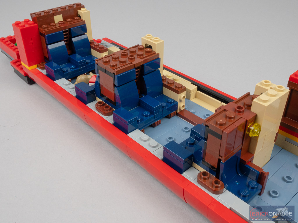 On continue côté arrière avec l’ajout de la première fenêtre, dont le cadre est posé horizontalement grâce à des éléments SNOT. On s’intéresse alors aux compartiments, dans lesquels on vient fixer la structure des sièges – et quelques éléments de décor dans celui inspiré par le premier film. On ajoute les assises et des éléments séparant le couloir des compartiments avant de passer à la suite.