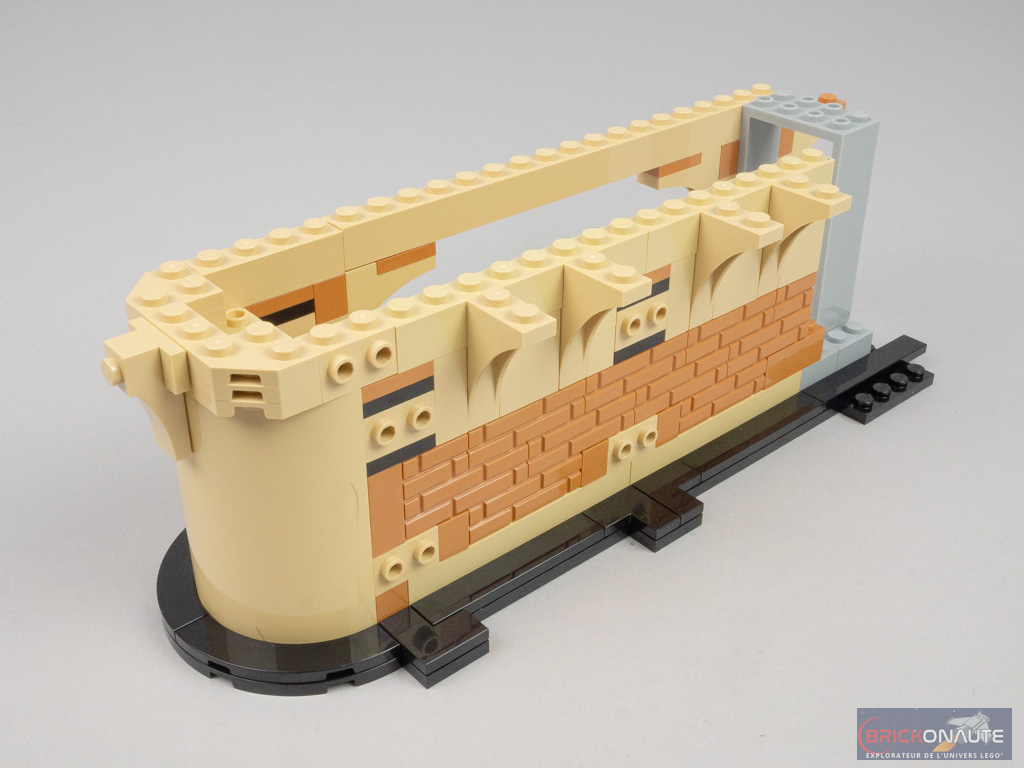 Nous attaquons enfin la dernière construction, la portion de quai utilisée pour représenter l’épilogue du 8ème film. La conception de la partie basse est assez simple et se limite à de l’empilement de briques avec quelques arches côté « caché » – l’ensemble est creux à l’arrière. Sur l’avant, une grande slope revêtue d’un sticker nous donne quelques infos sur le modèle. Des infos erronées… je vous en reparle un peu plus bas. En guise de décoration côté extérieur, on ajoute 4 colonnes qui font leur petit effet.