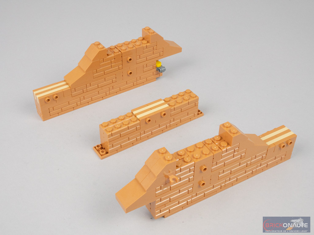 On construit ensuite 4 sous-ensembles, qui viennent se fixer sur le haut des plateformes, côté extérieur. Leur conception est intéressante et fait appel à de nombreux éléments SNOT – si bien que les éléments composant le liseré orange se retrouvent avec les tenons vers le bas. On complète légèrement le toit à l’arrière.