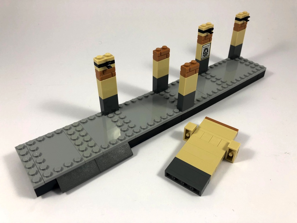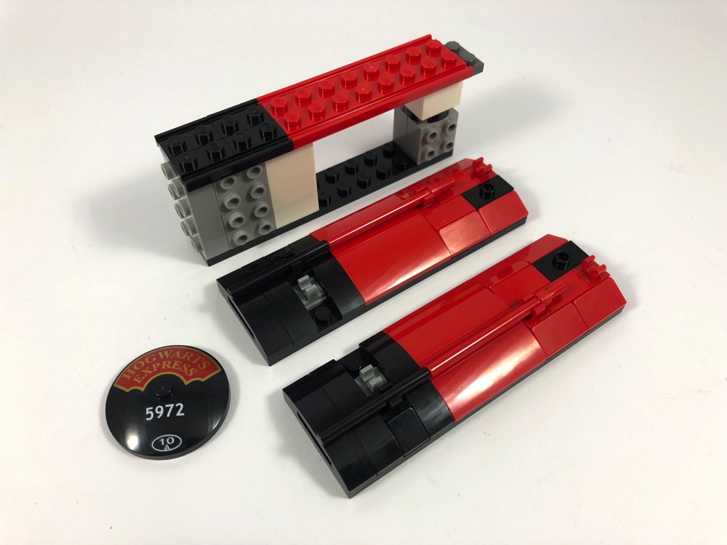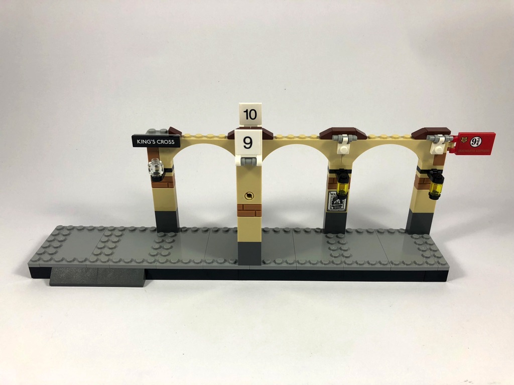 Les deux premiers sachets de pièces vont nous permettre de construire une partie de la gare de King’s Cross, plus précisément le quai 9 3/4 où stationne le Poudlard Express. Après avoir assemblé les deux premières minifigs, Lupin et Ron, et le chariot de ce dernier, nous démarrons avec le plus grand des deux quais. Il est constitué pour l’essentiel de briques noires couvertes de plates grises. On y ajoute ensuite les piliers, dont un porte une affiche « Wanted » avec la tête de Sirius Black. Entre deux de ces piliers, on construit un pan de mur articulé sur deux pins Technic permettant aux sorciers d’accéder à la plateforme 9 3/4. Des arches sont ensuite ajoutées pour relier les piliers, puis des réverbères fixés sur des clips. On notera qu’ils sont différents de part et d’autre du mur. On termine le premier sachet de pièces en ajoutant les numéros de quai et la pancarte « King’s Cross » (uniquement des autocollants).