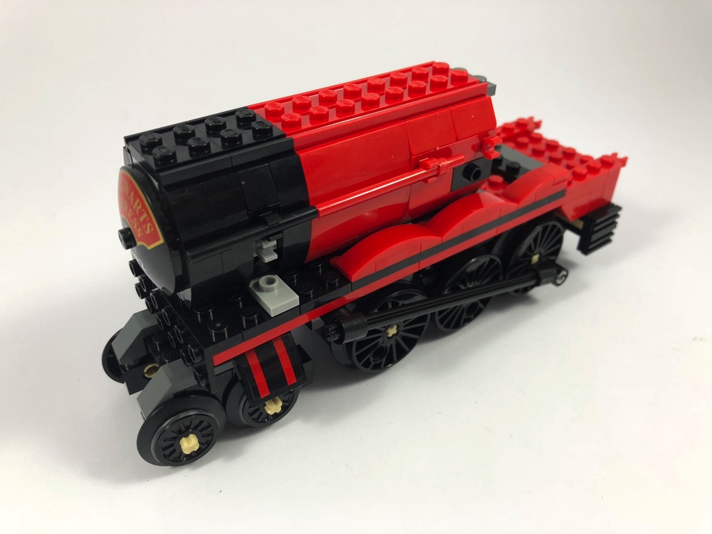 Le sachet n°4 commence par la construction de la chaudière. La structure interne de celle-ci est composée de briques SNOT identiques à celles trouvées dans les BrickHeadz. On couvre ensuite cette structure avec deux grandes plates noires habillées de slopes rouges et noires. Quelques clips permettent d’y fixer des éléments de tuyauterie. On termine la chaudière avec le beau dôme tampographié « Hogwarts Express » disposé à l’avant de celle-ci.