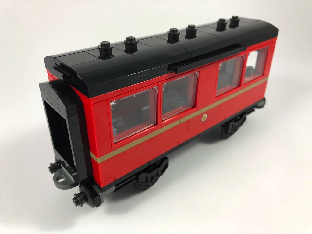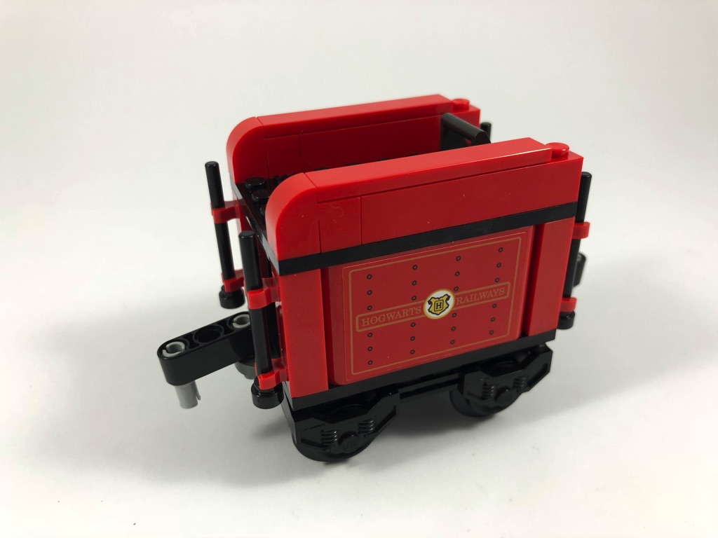 Le tender est le premier wagon situé derrière la locomotive. Il transporte le charbon et l’eau nécessaire au fonctionnement de celle-ci. Sa construction est plutôt simple. Elle se base sur une plate noire de 6×8 tenons, entourée de 4 panels dont deux décorés d’un grand sticker. La trappe sur le dessus est articulé et permettra sans mal d’y cacher une minifig. Les petites roues sont fixées sur deux axes métalliques, et deux liftarms permettent de relier ce tender à la locomotive et au wagon de passagers.