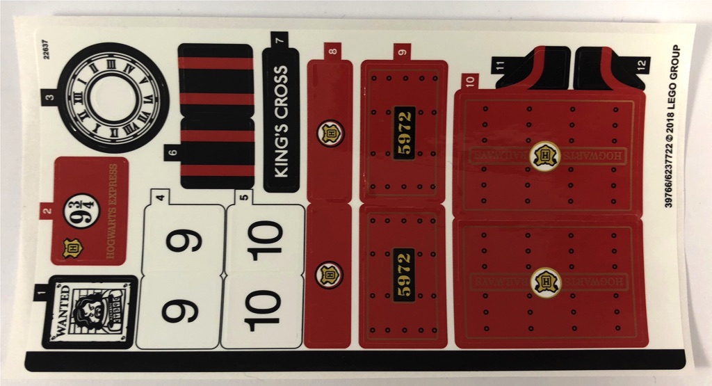 Le deuxième sachet de pièces commence par la construction de l’escalier sur le premier quai. Escalier qui mène à la passerelle reliant les deux quais. On construit ensuite le second selon le même principe : un escalier noir menant à une plate entourée de garde-corps. Il est donc temps d’assembler la passerelle reliant les deux quais. De grandes arches noires (plutôt rares, elles apparaissent seulement dans 3 sets) supportent une plate et des marches grises. Des garde-corps et des rampes reddish brown articulées sur des clips sont ajoutés. On termine cette passerelle avec l’horloge (un autocollant). Enfin, le deuxième sachet de pièces se termine avec le présentoir à journaux tampographié : on y trouve le Daily Prophet avec le titre « Exclusive – Harry Potter – The Boy Who Lived« .