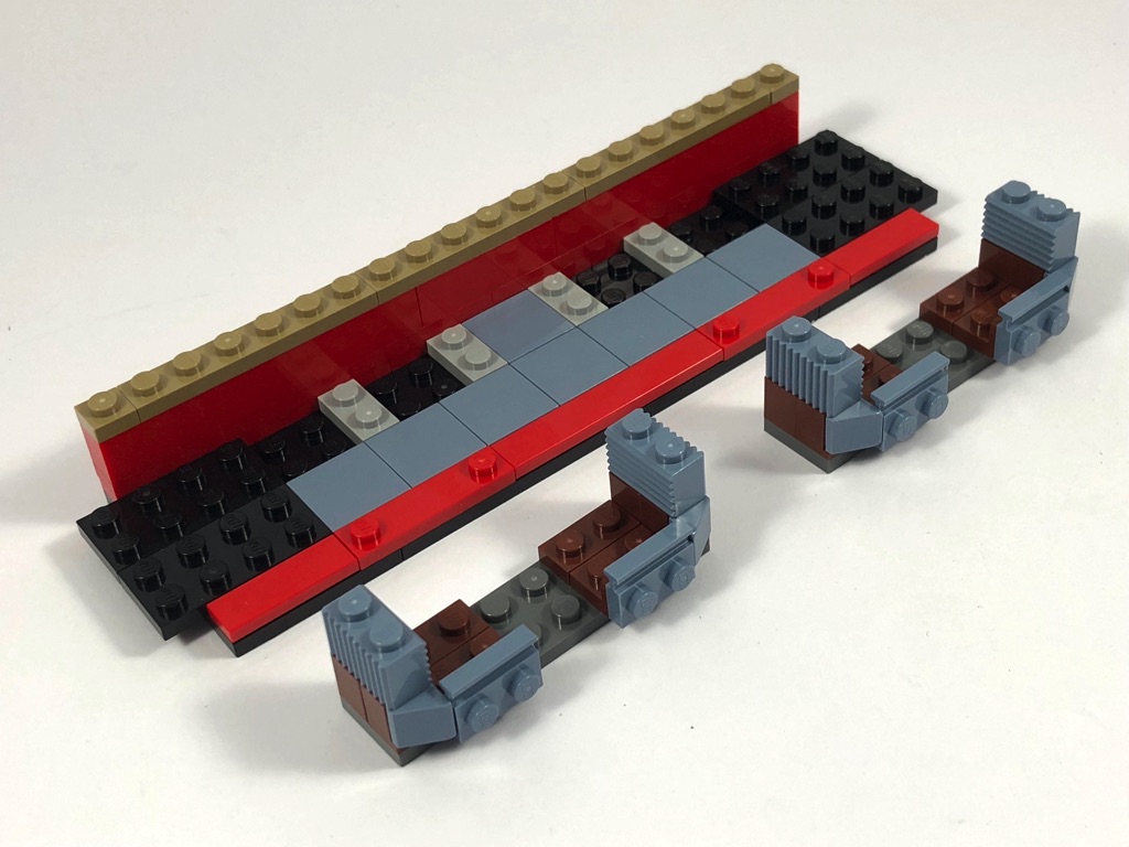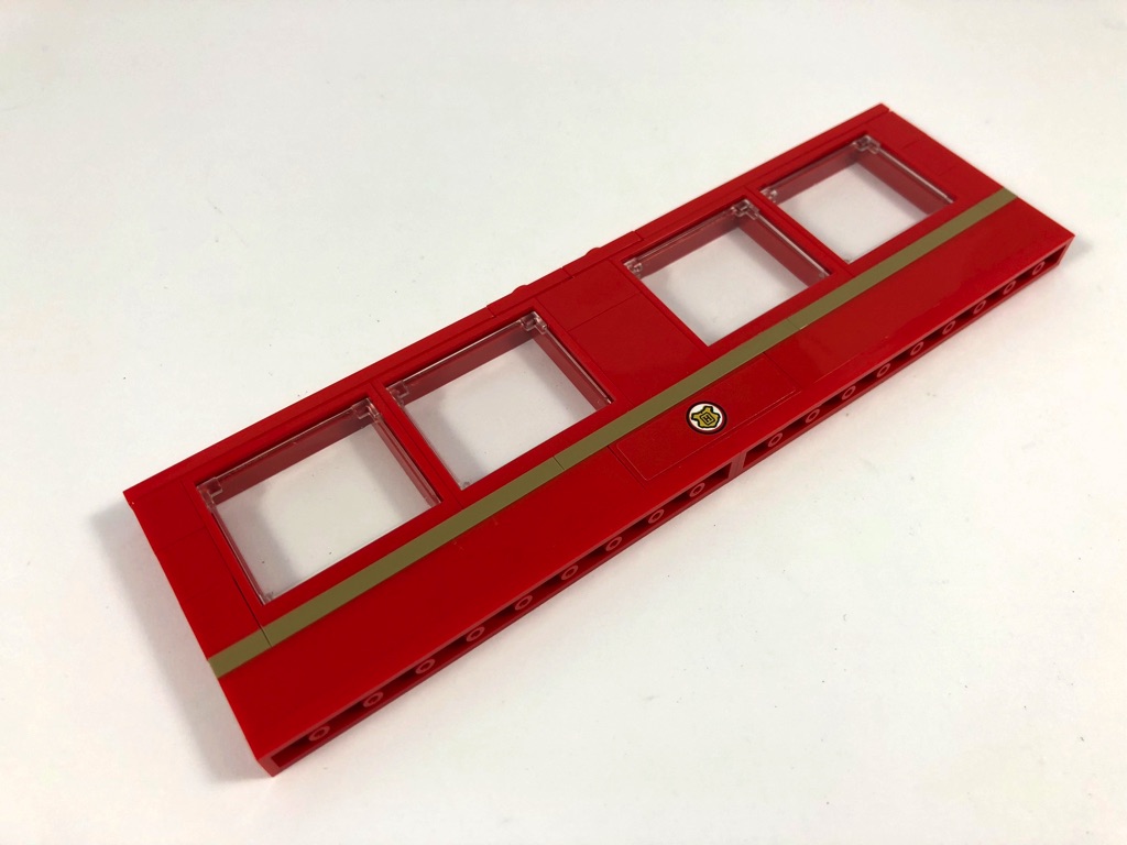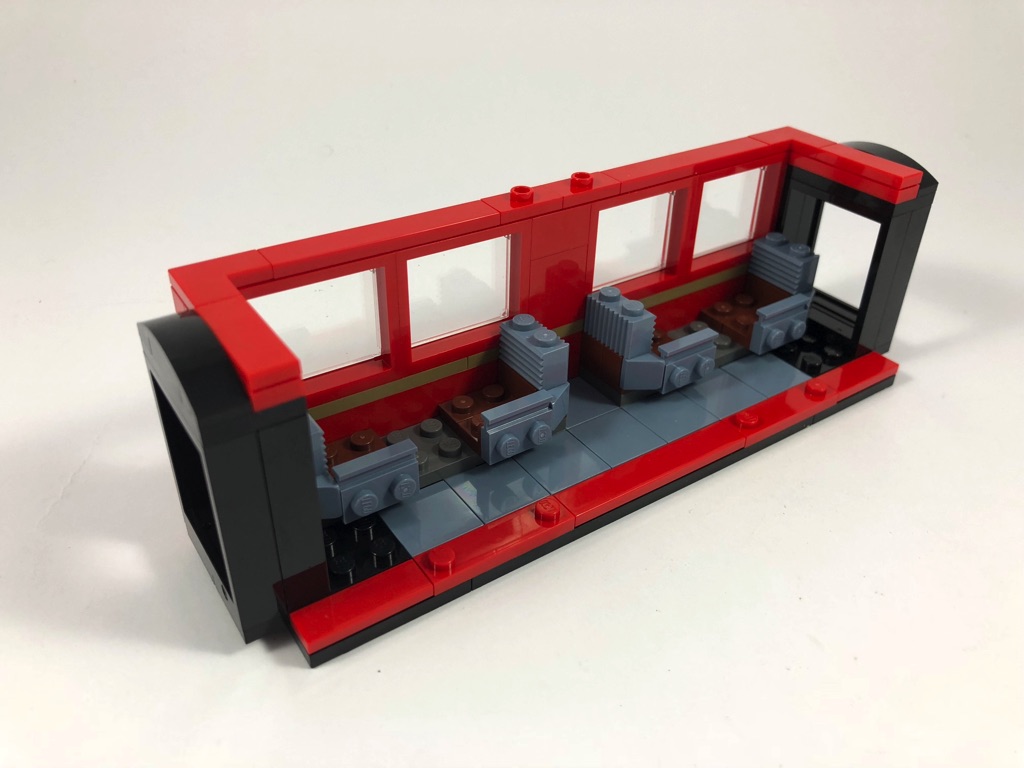 Le wagon est construit sur une base noire de 6 par 20 tenons. On construit la partie basse du premier « mur » avant d’ajouter deux ensembles de sièges pour les passagers. On notera qu’avec leurs petites jambes, les jeunes élèves ne peuvent pas s’asseoir, il faudra les mettre debout sur les sièges. On continue avec 4 fenêtres battantes et deux portes d’accès au wagon. La partie haute est couverte de tiles à la manière des bâtiments modulaires. C’est ainsi que se termine l’avant-dernier sachet de pièces.