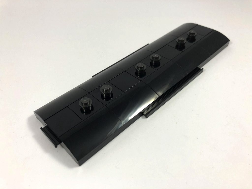 Le septième et dernier sachet de pièces démarre avec la construction du second « mur ». Il n’est fixé au wagon que par quelques tenons afin d’être facilement amovible pour accéder à l’intérieur. On retourne ensuite le wagon pour y fixer les deux essieux et quelques décorations. On termine le train avec l’assemblage du toit du wagon, composé pour l’essentiel d’une grande plate couverte de slopes noires. Lui aussi n’est fixé que par quelques tenons, à la manière des bâtiments modulaires, de façon à accéder facilement à l’intérieur.