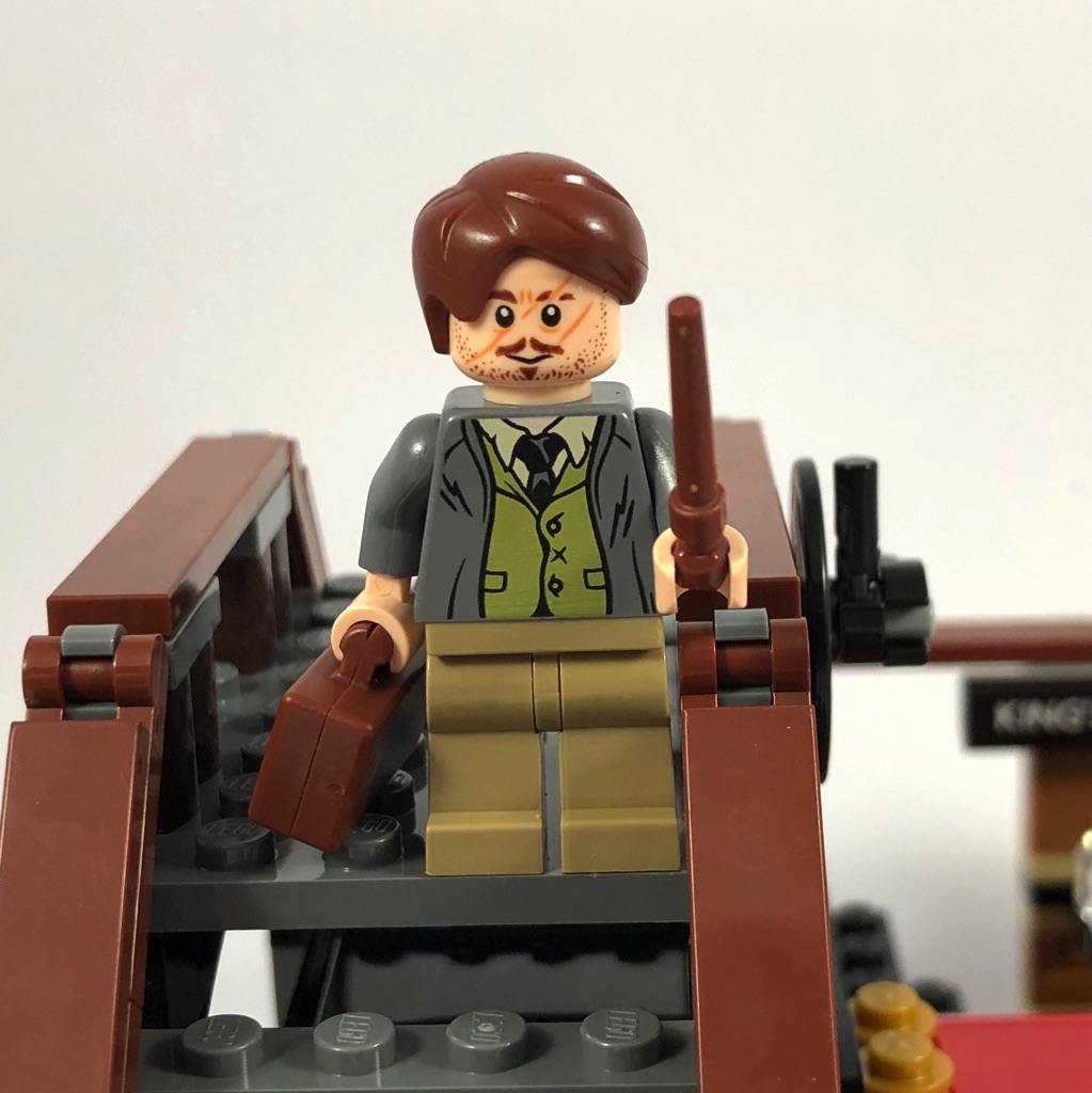 Rémus Lupin porte une veste grise au-dessus d’un gilet kaki. une chemise blanche et une cravate dépassent au niveau du col. Le visage est finement tampographié d’une barbe naissante et d’une petite moustache. Il porte une valise et dispose d’une baguette magique. Détail intéressant : la seconde expression du visage le présente dans sa forme loup-garou.