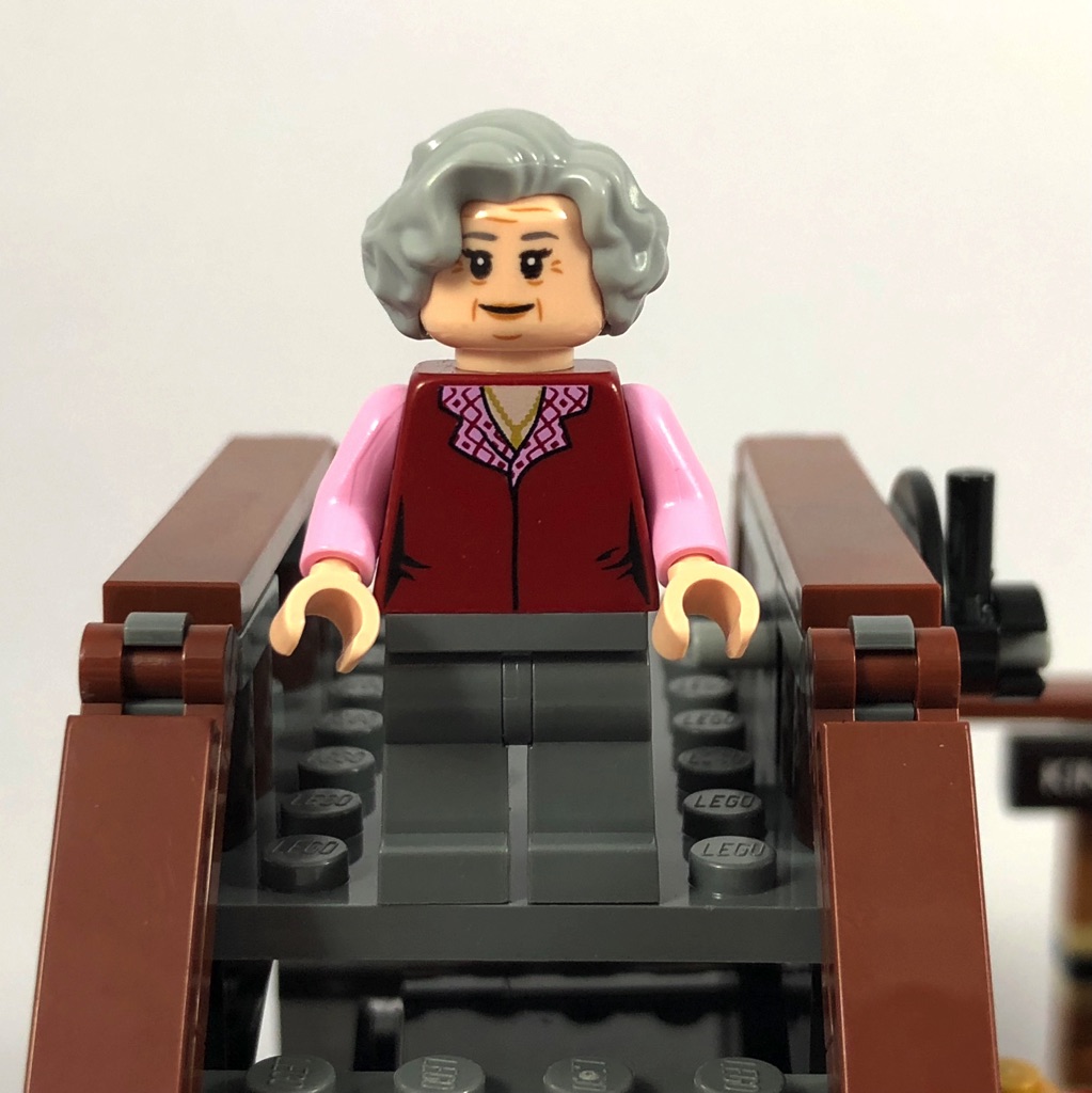 Difficile de traduire le nom de trolley witch mais d’après le descriptif officiel du set il s’agit de la « sorcière à chariot ». C’est elle qui vend des friandises dans le train. Elle porte un gilert rouge au dessus d’un chemisier rose. On devine les motifs de celui-ci au niveau du cou, ainsi qu’une chaîne et un pendentif. De légères rides se dessinent sous ses cheveux gris. Elle aussi est apeurée sur l’expression alternative de son visage.