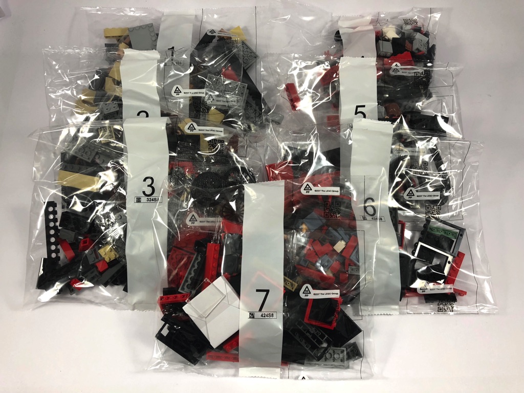 À l’intérieur, nous trouvons 7 sachets de pièces numérotés de 1 à 7, ainsi qu’une notice d’instructions de 124 pages et une planche d’autocollants avec 18 d’entre eux.