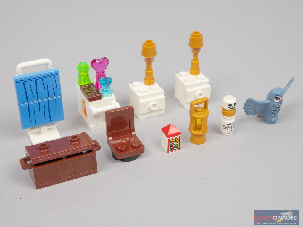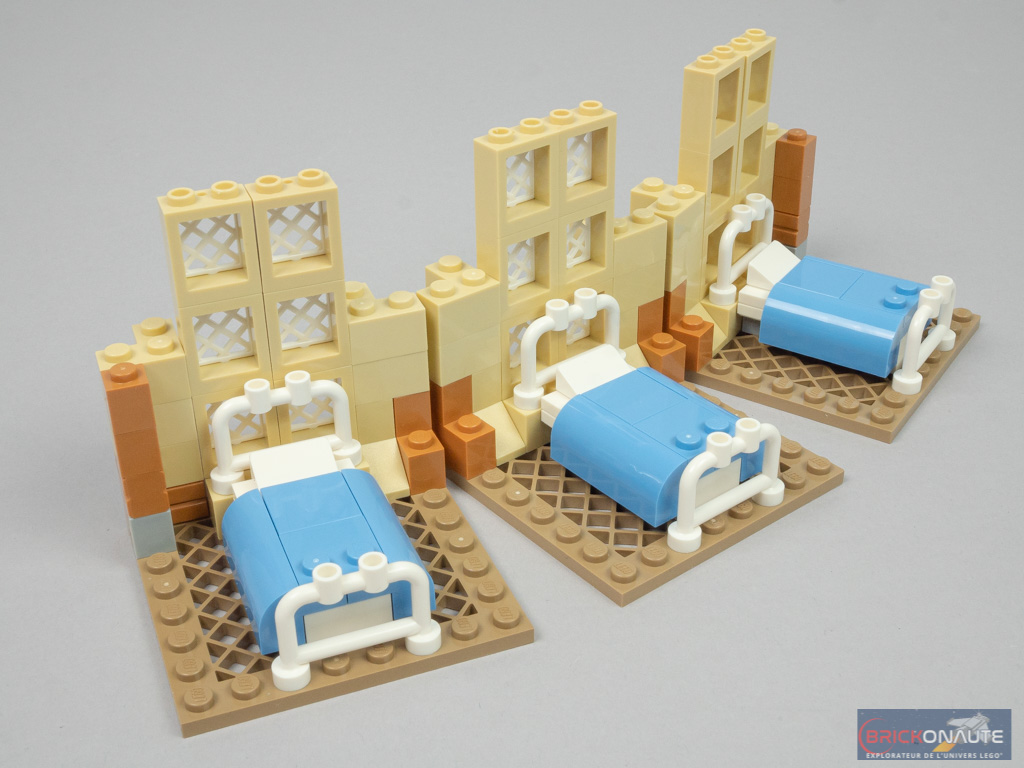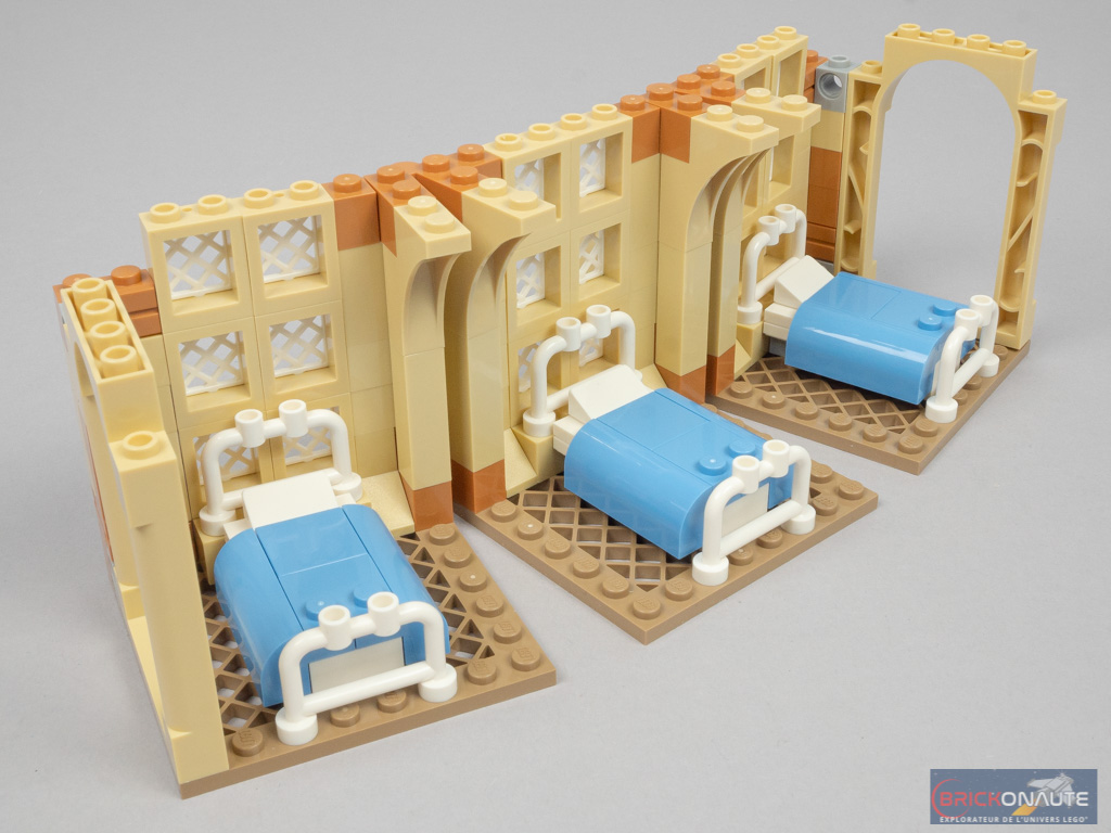 On continue en assemblant plein de petits accessoires : un coffre, une chaise, une lanterne, une fiole de Skele-Gro (Pouss’Os en VF), un rideau, un chariot d’hôpital, deux tables de chevet, des lampes de chevet et quelques fleurs. On passe alors au niveau supérieur, où deux sous-ensembles identiques portent un morceau de toiture dont l’angle est trouvé grâce à des charnières.