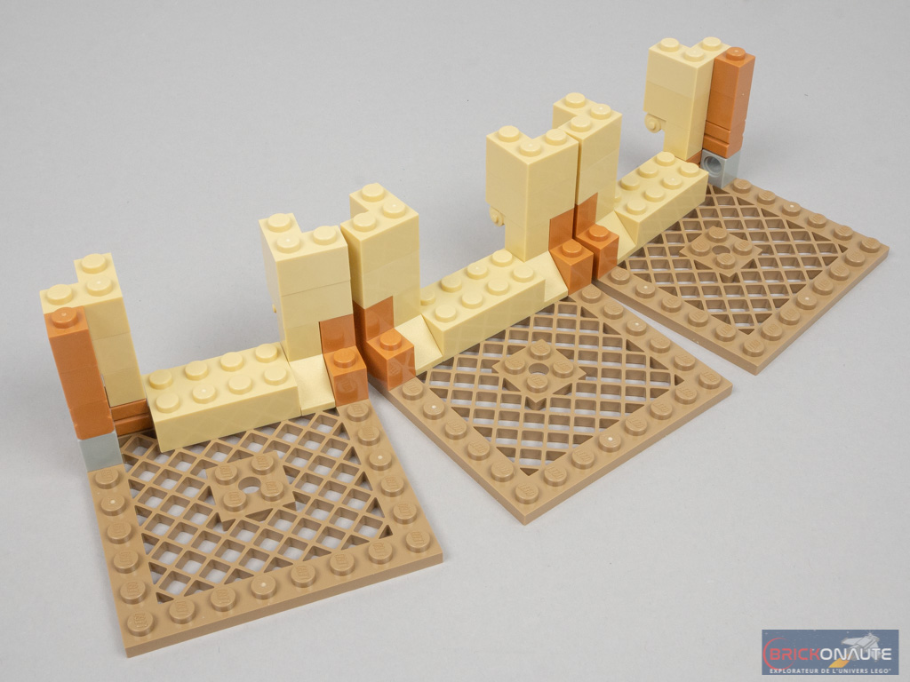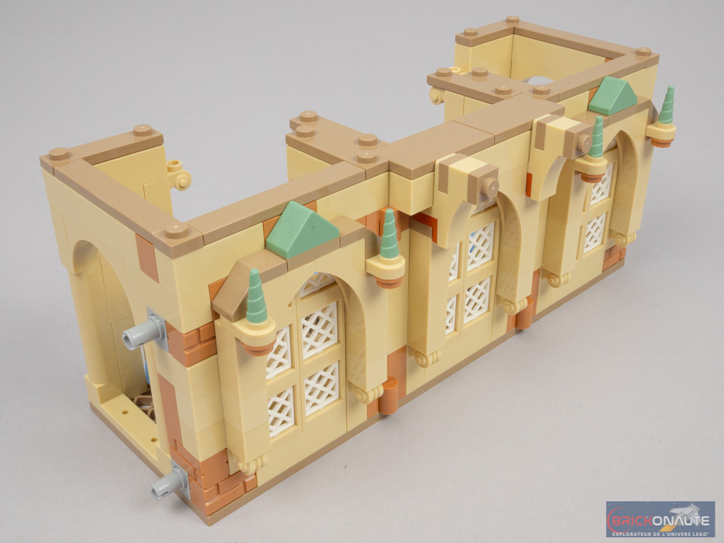 Avec le deuxième sachet de pièces, on termine le mur du fond et on ajoute des arches sur les côtés et sur l’avant. Côté extérieur, on décore les fenêtres avec d’autres arches, pour former des voûtes. En partie supérieure, une rangée de tiles et quelques tenons est dévolues à recevoir le niveau supérieur.