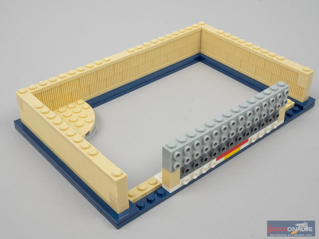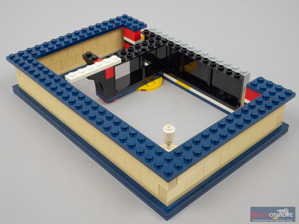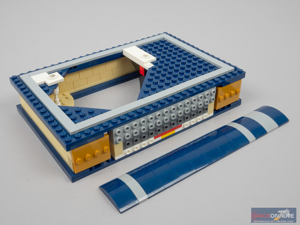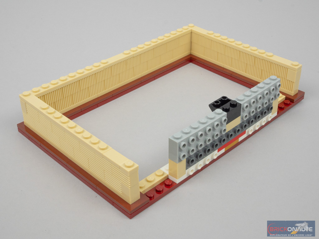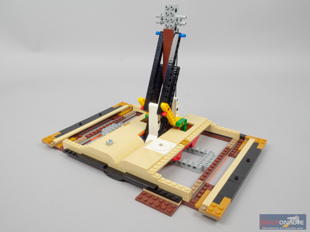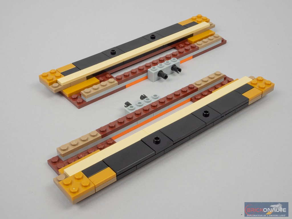 On enchaîne avec une première partie du support d’exposition des minifigs. Sa conception est en quelque sorte « modulaire » : des éléments Technic situés aux extrémités permettront si besoin de le rallonger, pour exposer l’intégralité de sa collection de minifigs dorées. Remarquez au milieu la jolie tile tampographiée.