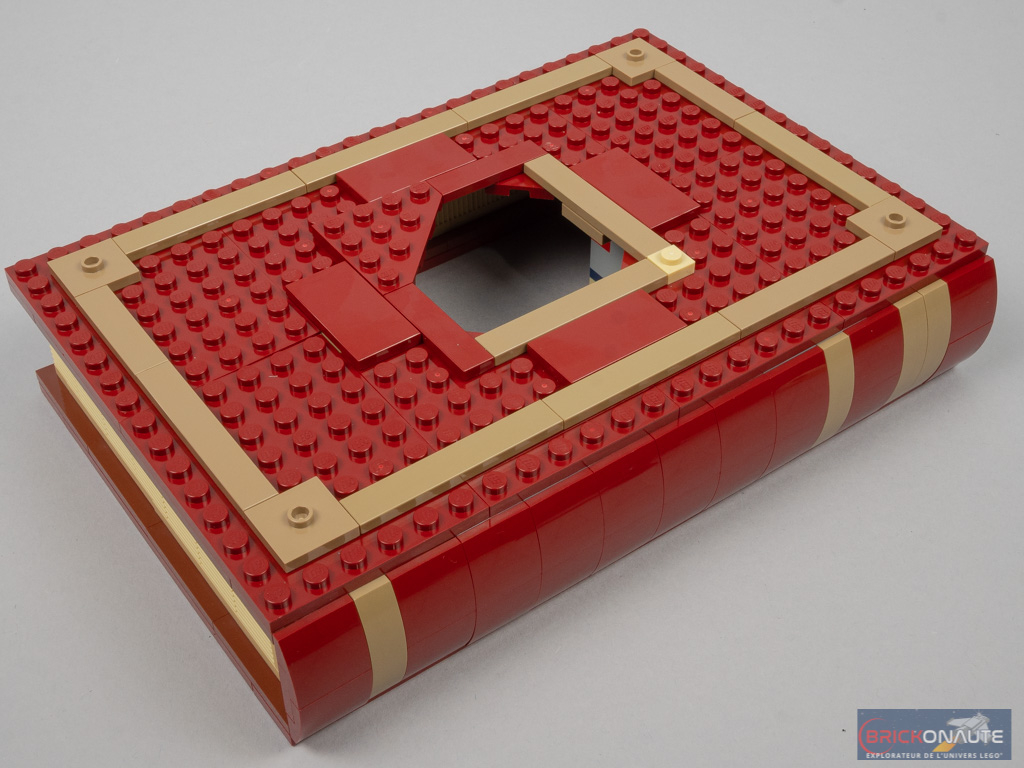 Il manque encore quelques pages à ce livre, et la manière de les réaliser est très astucieuse. On fixe un panel qui constitue la page supérieure sur des éléments SNOT solidaires de la structure, puis on vient ensuite insérer dans l’interstice 3 autres panels posés les uns sur les autres. Ces panels ne sont finalement fixés à rien – on vient juste les bloquer en position en complétant la couverture du livre. On complète alors avec de grandes slopes de couleur tan, et le journal de Tom Jedusor est terminé.