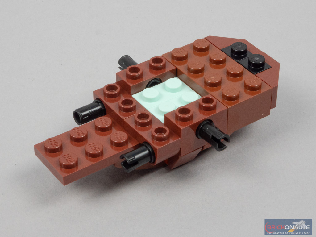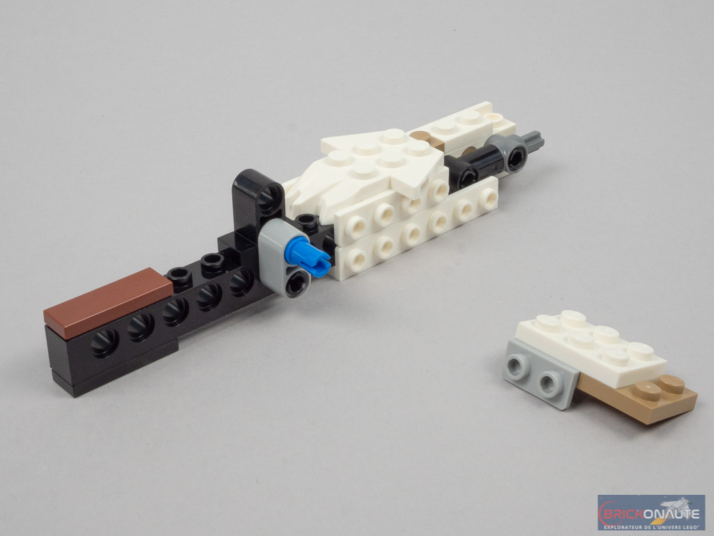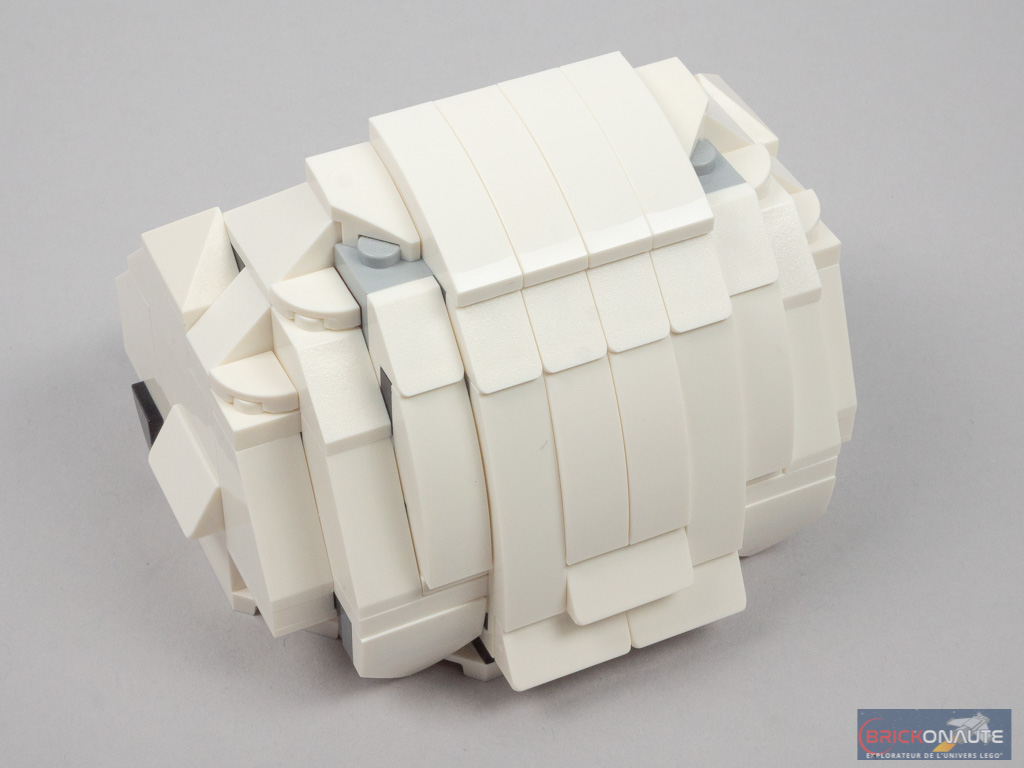 Nous passons ensuite au buste de l’animal, qui commence par la construction d’une structure à base de briques SNOT. On vient ensuite habiller les différentes faces de grandes slopes blanches, souvent vues dans les modèles automobiles. En partie basse, on vient clipser les deux premières plumes de la queue. Remarquez également les éléments Technic légèrement saillants, qui serviront à la fixation de la bestiole sur ses pattes.