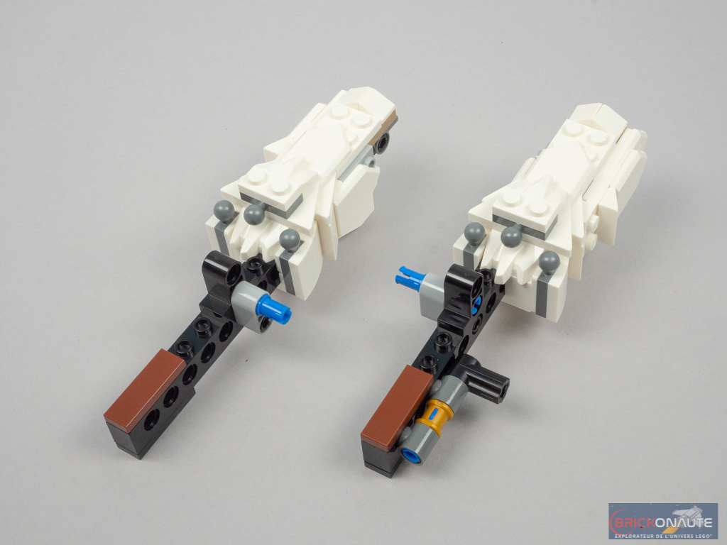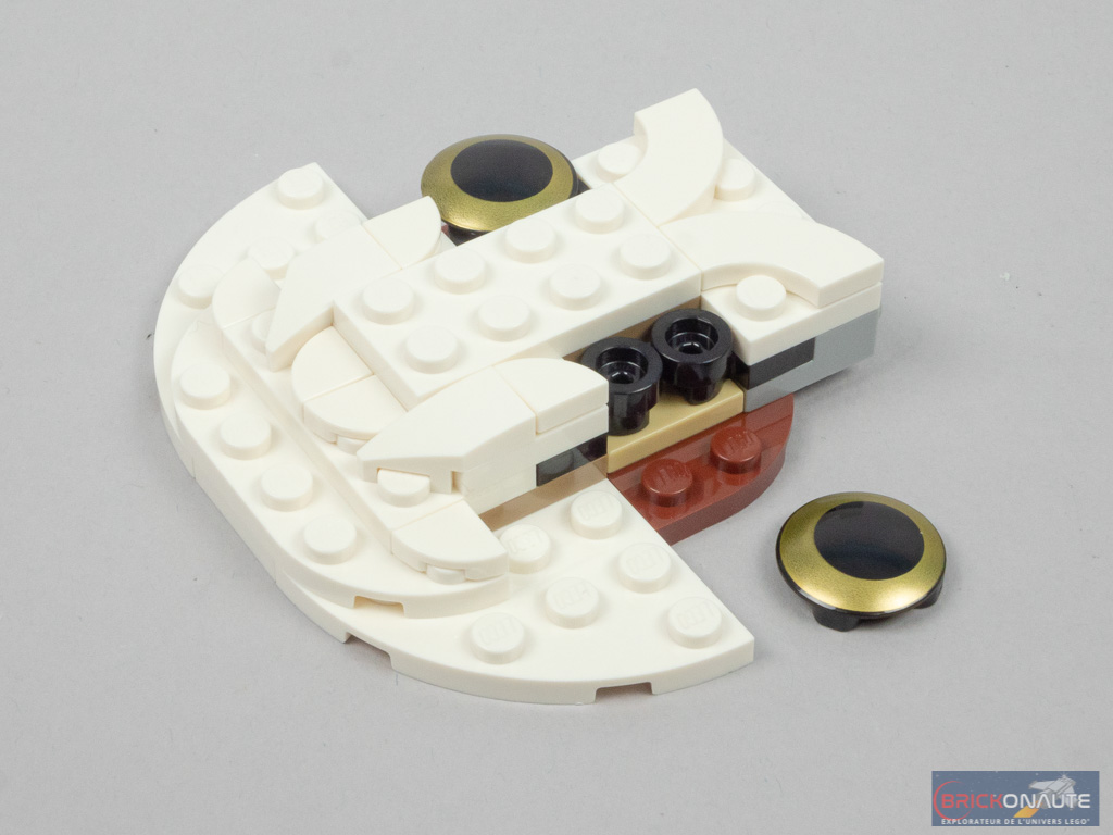 On continue justement avec la face, dont les yeux sont fixés de manière astucieuse. Remarquez d’ailleurs ces jolis yeux tampographiés, identiques à ceux trouvés dans le set 75979 Hedwig. On fixe la face aux charnières de la structure, puis la tête sur la turntable laissée en attente en haut du corps. On pourra donc orienter la tête comme on le souhaite. On continue avec 4 sous-ensembles de plumes. Les deux premiers, les plus petits, sont clipsés en partie basse des ailes. Les deux autres sont attachés sur les axes Technic en partie haute.