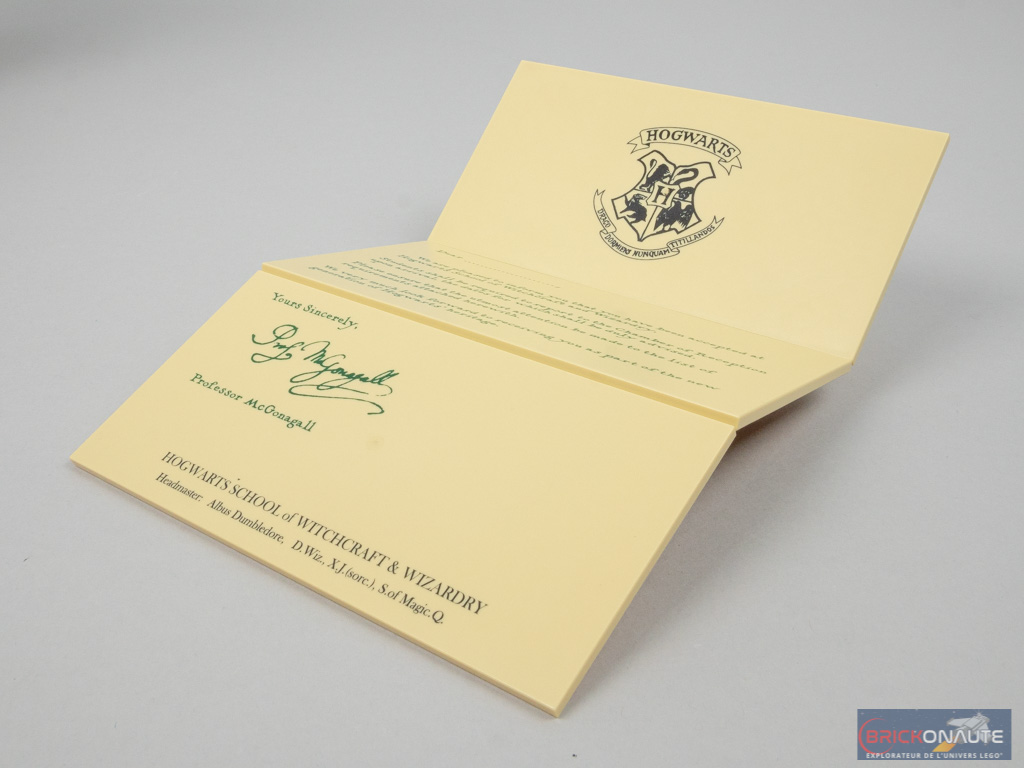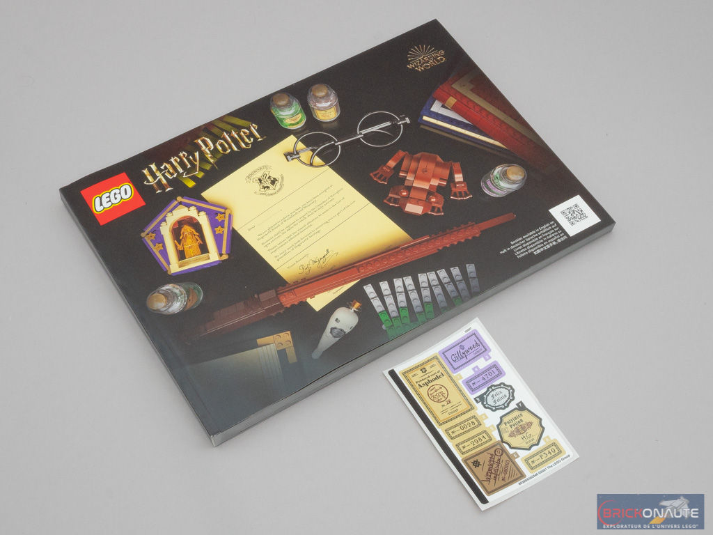 À l’intérieur, on trouve 22 sachets numérotés de 1 à 22, 3 tiles de couleur tan tampographiées avec la lettre d’admission à Poudlard, une notice d’instructions de 412 pages et une petit planche de 9 autocollants. La notice commence par quelques pages dédiées à l’histoire de la gamme LEGO Harry Potter et à la genèse du set. Au fil des pages et à la fin de chaque construction (les lunettes, les potions…), on trouve une page avec quelques infos relatives à l’accessoire construit.