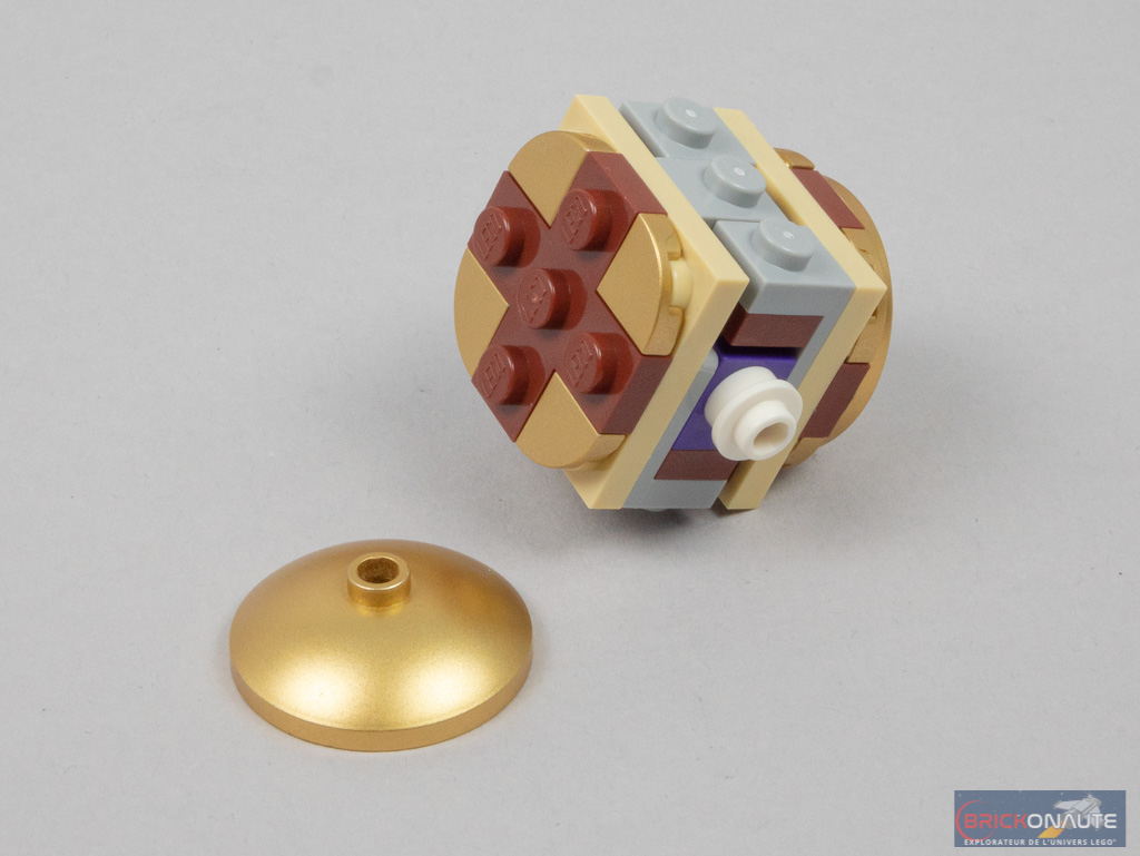 Il manque encore quelques accessoires pour que notre ensemble soit complet. À commencer par le vif d’or, dont la structure interne est plutôt intéressante puisqu’elle permet de placer des tenons dans toutes les directions, pour venir ensuite y fixer les 6 dishs dorés. Les deux grandes ailes sont attachées sur des clips, et l’ensemble fixé par un axe Technic au socle d’exposition.