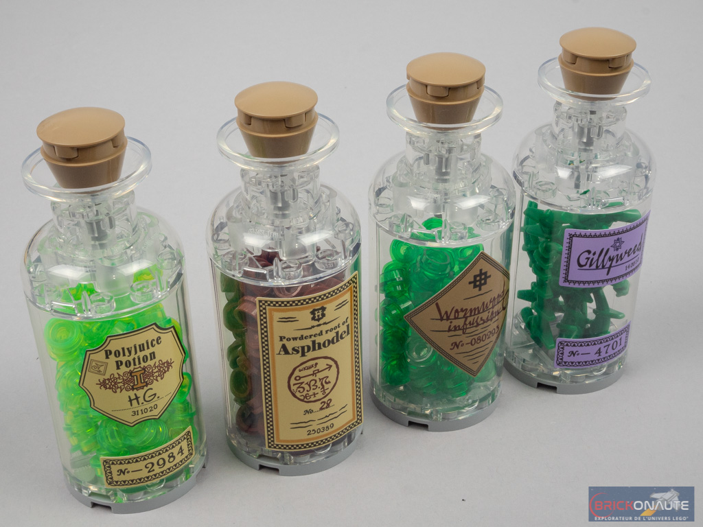 Les potions sont toutes réalisées de la même manière : deux demi-cylindres transparents, un cône pour remplir un peu, et beaucoup de petites round plates jetées à l’intérieur en guise de liquide. Le nombre de plates (et donc le « niveau » du liquide) est différent d’une fiole à l’autre. L’une des fioles (celle de Branchiflore, ou Gillyweed en anglais) contient quelques lianes. C’est lors de cette étape qu’on applique quelques autocollants.