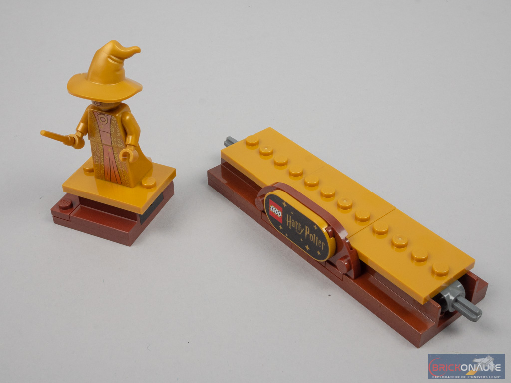 Le dernier « accessoire » n’en est pas vraiment un, puisqu’il n’est pas tellement cohérent avec le reste : le présentoir à minifigs. Avec ses 3 minifigs dorées de Minerva McGonagall, Rubeus Hagrid et Albus Dumbledore. Ce dernier étant le seul à avoir droit à son nom tampographié, et à être présenté dans une carte de Chocogrenouille. La tampographie de ces minifigs est globalement bien réalisée, mais ces dernières n’auront d’intérêt que si vous vous êtes lancé dans la collection des minifigs dorées dédiées au 20ème anniversaire de la gamme LEGO Harry Potter – rappelé dans le dos de chacune de ces minifigs, et par une tile tampographiée sur le socle.
