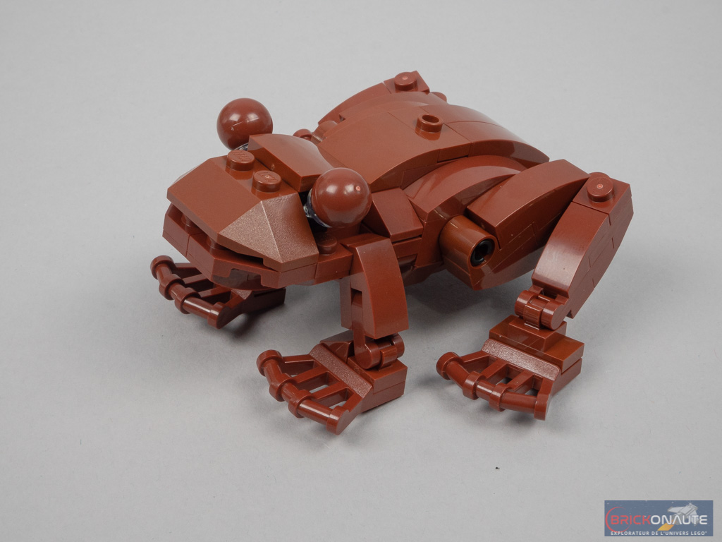 Nous construisons alors la Chocogrenouille. Les pattes sont reliées au corps par des pins Technic, tandis que ce sont des charnières plates au niveau des cuisses – n’autorisant donc qu’un seul degré de liberté et limitant les positions possibles. Pour le reste, les formes sont plutôt bien trouvées. On assemble également dans cette étape une deuxième « extension » du support, avec Hagrid.