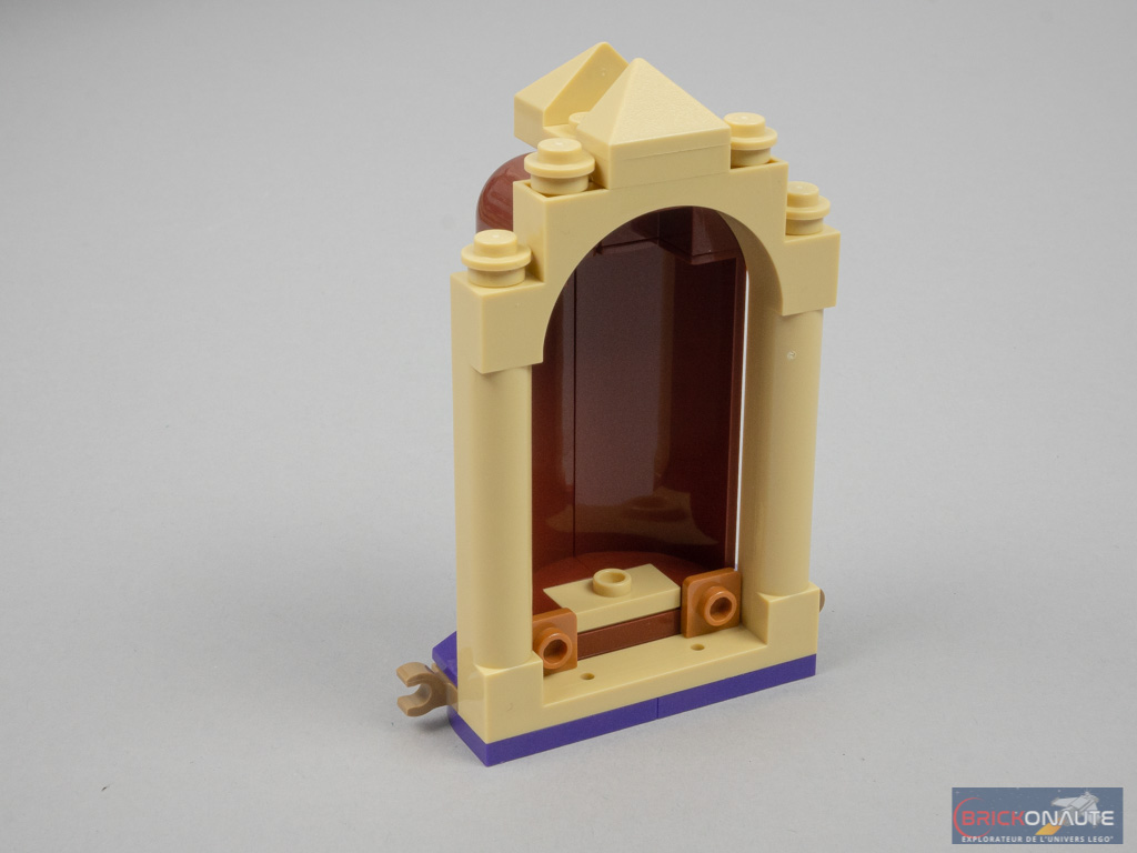 Nous continuons avec la partie centrale et la carte de Chocogrenouille. En partie centrale, une arche et une alcôve marron contiendront la minifig d’Albus Dumbledore, dont le nom est tampgraphié. Autour, la forme pentagonale est obtenue en clipsant 4 sous ensembles entre eux, puis à la base – c’est bien conçu, les vides entre les éléments étant quasiment inexistants.