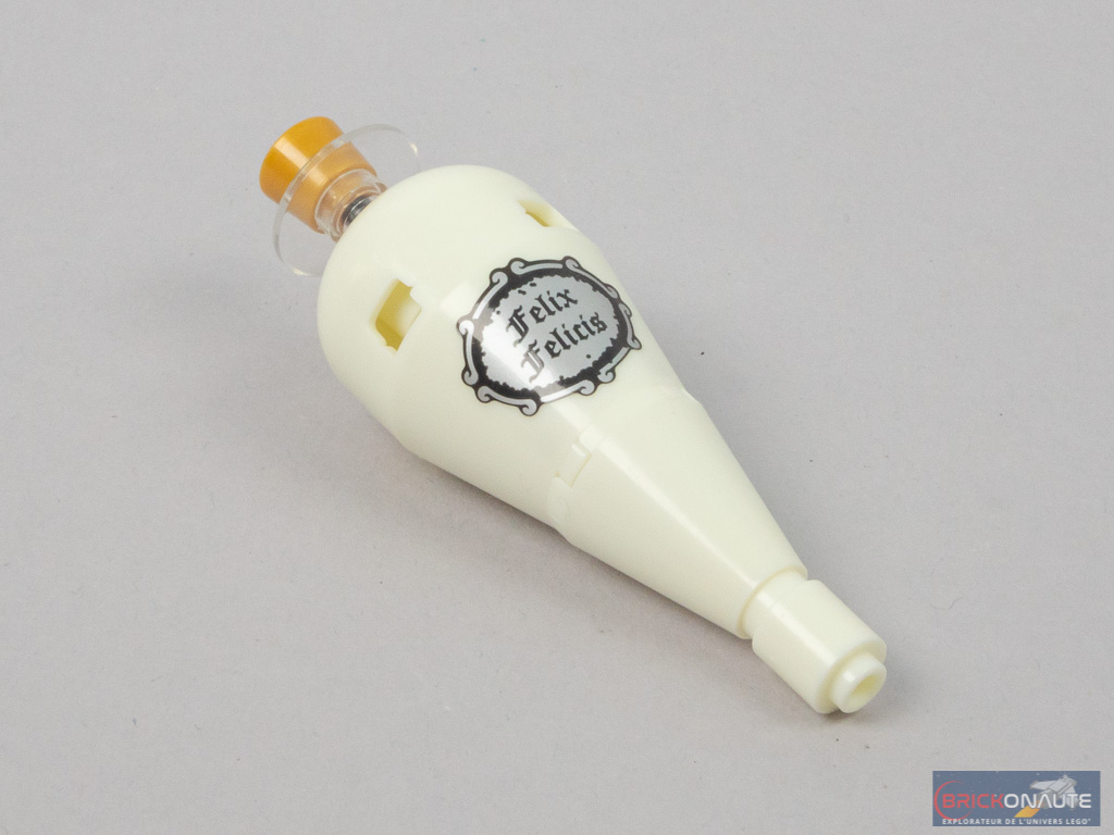 Nous commençons par l’accessoire qui caractérise le mieux notre sorcier : ses lunettes. Elles font appel à deux nouveaux éléments pour la monture, reliés par des éléments Technic. Les branches sont également des barres Technic. On s’occupe ensuite de la potion de chance Felix Felicis – assemblée en moins d’une minute à l’aide de pièces brillant dans le noir.
