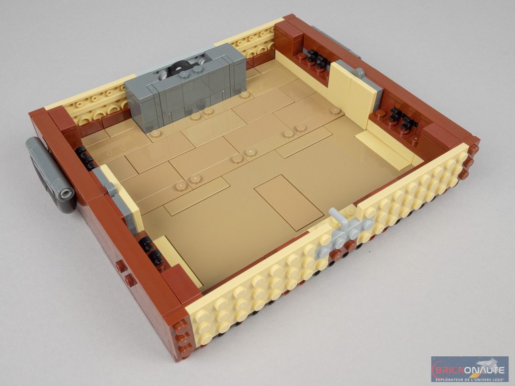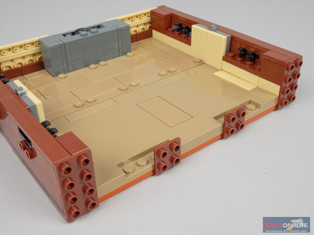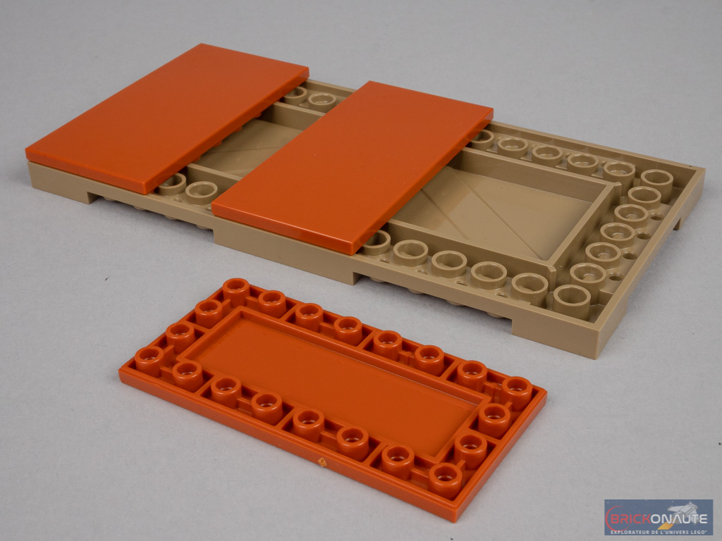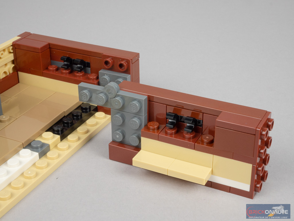 On construit deux nouveaux sous-ensembles, symétriques, qui viennent se fixer aux précédents avec deux charnières. Là encore, des clips côté intérieur serviront à attacher les décors. En guise de sol, on utilise ici une demi plaque de route, qu’on a pu voir dans la gamme LEGO City dernièrement, colorée en dark tan pour l’occasion. Au-dessous, elle est pavée de grandes tiles inversées de 8×4 tenons et de quelques éléments reddish brown. Côté extérieur, des éléments SNOT sont surmontés de grandes plates, et seront eux aussi décorés aux couleurs de votre maison préférée. Au milieu, une plate modifiée servira à verrouiller la malle.