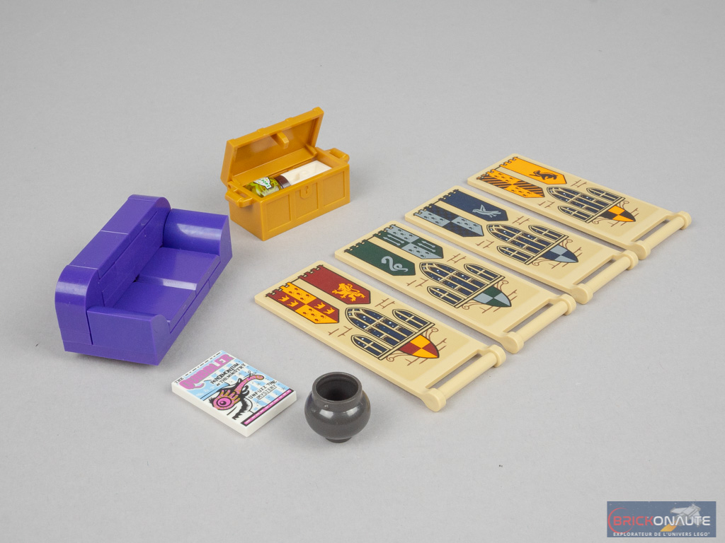 Chose étonnante, l’inventaire à la fin de la notice d’instructions est complètement erroné. Les références de pièces sont bonnes, mais pas le nombre pour chacune d’entre elles. La lecture de cet inventaire m’a néanmoins permis de découvrir une jolie collection d’éléments intéressants. On trouve ainsi de nouvelles pièces, comme des grandes tiles inversées de 8×4 tenons, de jolis éléments dorés, beaucoup d’éléments tampographiés comme le journal le Quibbler ou la carte du Maraudeur et, évidemment, plein d’éléments de minifigs tous plus intéressants les uns que les autres.