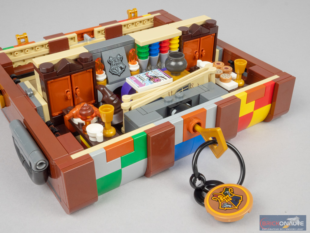 Avec, pour commencer, le même défaut que dans la série de « livres-classes » de la même gamme (et nous reparlerons des deux nouveaux sous peu) : il est très difficile de transporter les minifigs dans la malle et tous les éléments de personnalisation. Elle est déjà bien pleine avec les différents accessoires fournis.