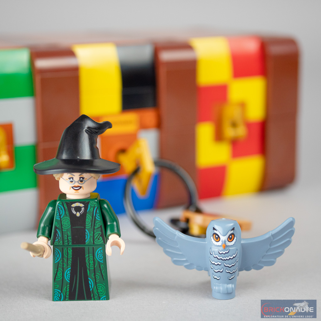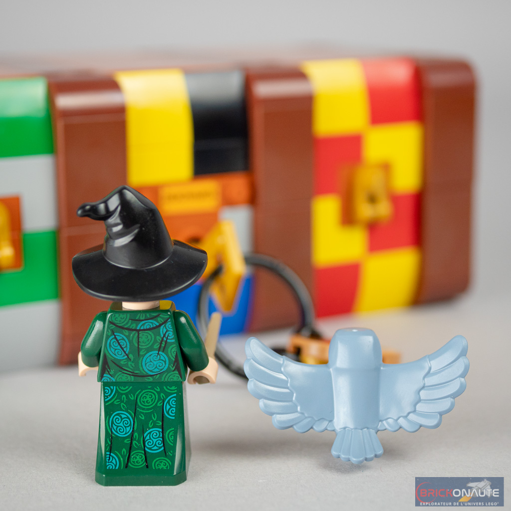 La seule minifig « imposée » dans le manuel d’instructions est celle du professeur McGonagall, dans une tenue qui était jusqu’ici exclusive au set 76382 Hogwarts Moment: Transfiguration Class. La robe est très joliment travaillée, elle aurait par contre peut-être mérité d’être tampographiée sur les côtés. La professeure a droit à un double visage, et un chapeau duquel dépasse sa chevelure. Elle est accompagnée d’une chouette, dans une couleur sand blue inédite jusqu’ici.