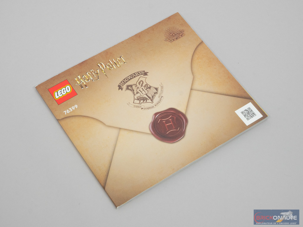 À l’intérieur, on trouve 5 sachets de pièces numérotés et un élément qu’on a vu pour les demi-plaques de routes de la gamme LEGO City, cette fois-ci en dark tan et qui servira de fond pour la malle. La notice d’instructions compte 128 pages, et on trouve 2 planches d’autocollants. Elle représente une enveloppe contenant très certainement la lettre d’admission à Poudlard. On remarquera que le blason de l’école a été modifié, après l’erreur vue dans le set 76391 Hogwarts Icons Collectors’ Edition : c’est bien Draco Dormiens Nunquam Titillandus (Ne chatouillez jamais un dragon qui dort), et non Titillandos.