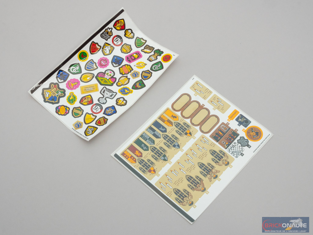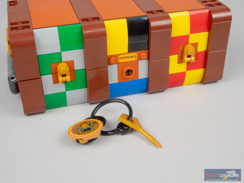 En termes de possibilités de personnalisation, LEGO permet également de choisir les couleurs de votre maison préférée pour décorer la malle – j’ai pour ma part fait un mélange des quatre. Notez cependant qu’une fois la construction terminée, si vous changez d’avis, le démontage n’est pas forcément chose aisée. Pour personnaliser encore plus l’ensemble, LEGO fournit également une grande planche d’autocollants que vous pourrez (ou non) appliquer où vous le souhaitez. La malle est d’ailleurs plutôt jolie, et LEGO propose une petite clef qui permet de la verrouiller. On évitera par contre de la regarder depuis l’arrière : ce sont les différents meubles qui font office de « fond » une fois la malle fermée.