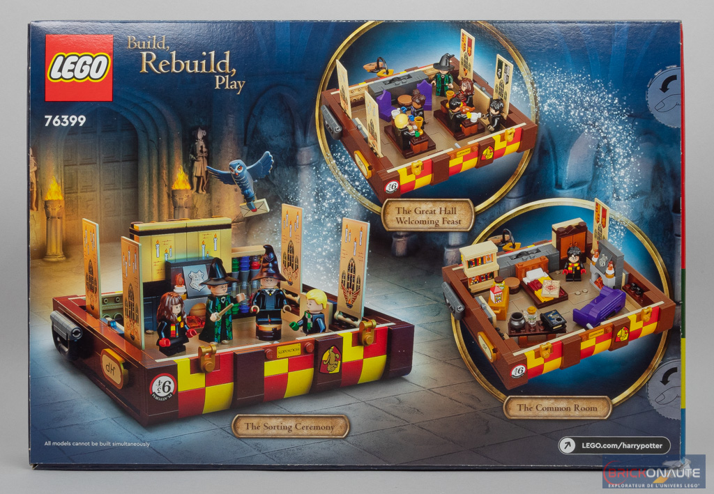Au dos, on trouve les 3 scènes cultes que LEGO nous propose de reproduire avec cette malle : la fête de bienvenue dans la Grande Salle, la Cérémonie de Répartition, et Harry dans la salle commune de Gryffondor. Je parle rarement des tranches de la boîte, mais sur le haut on retrouve les différentes pièces qui serviront à personnaliser la construction : les éléments de minifigs, les meubles, ou encore les pièces de couleur pour la malle.