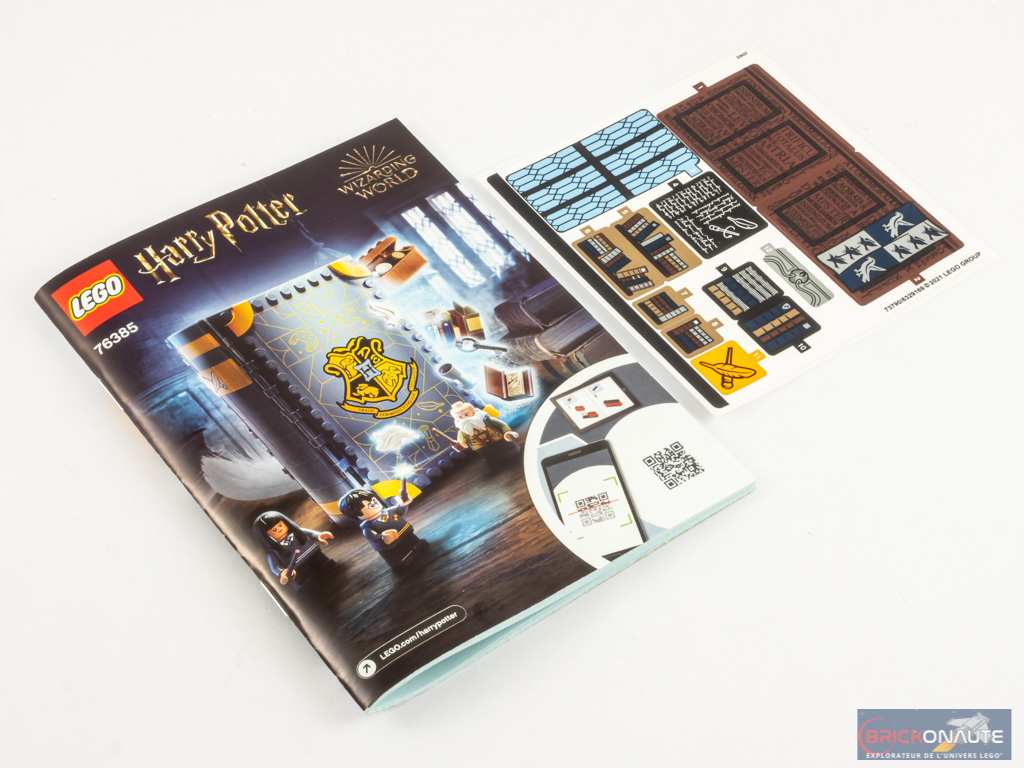 A l’intérieur, nous trouvons 2 sachets de pièces numérotés, deux couvertures de livre aux couleurs de Serdaigle, une plate de 2×16 tenons ; ainsi qu’une notice de 84 pages pour 84 étapes de construction et qu’une planche de 12 autocollants.
