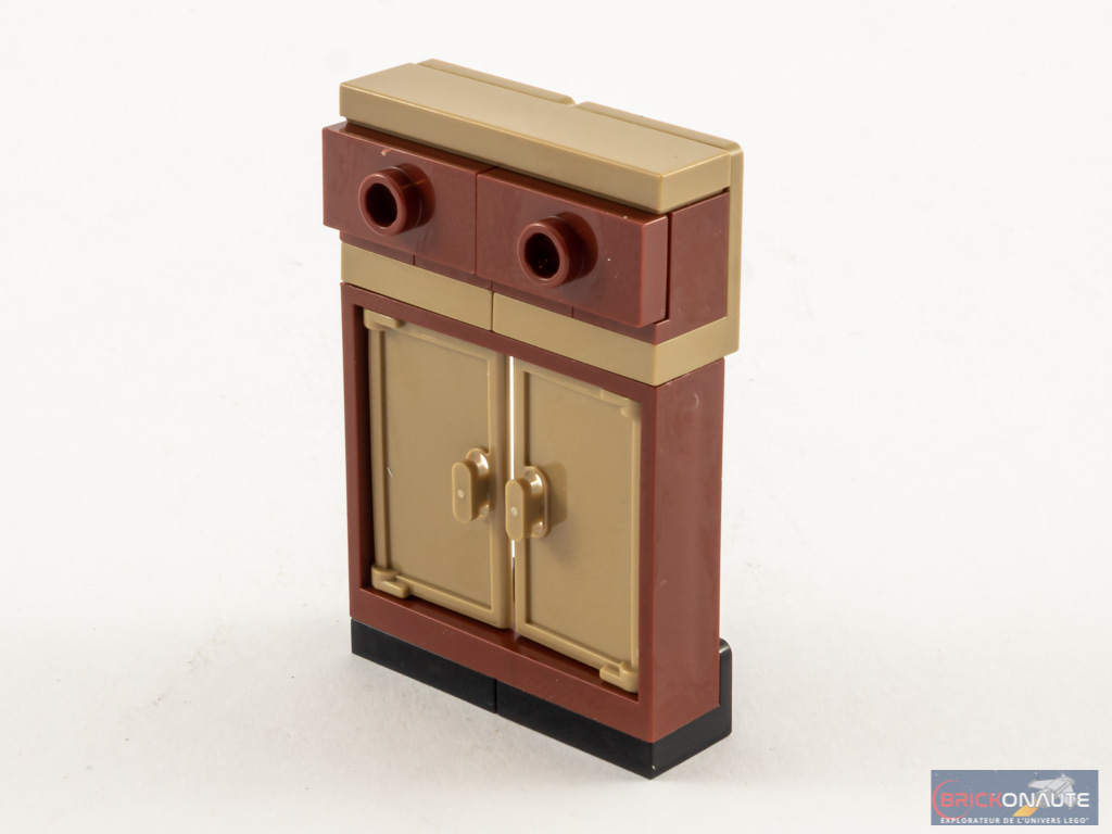 Nous attaquons le second sachet avec un premier assemblage qui prend place sur la tranche, au-dessus de la petite armoire précédemment assemblée. On s’occupe alors des éléments de décor situés sur les deux couvertures. Ce dernier set est conçu comme le set 76382 Hogwarts Moment: Transfiguration Class : les éléments de décor sont fixés sur les couvertures et se déploient vers l’extérieur grâce à des charnières. Nous trouvons ici côté droite, un tableau noir et une cheminée ; et côté gauche une bibliothèque et une arche, qui pourrait être l’entrée de la salle.
