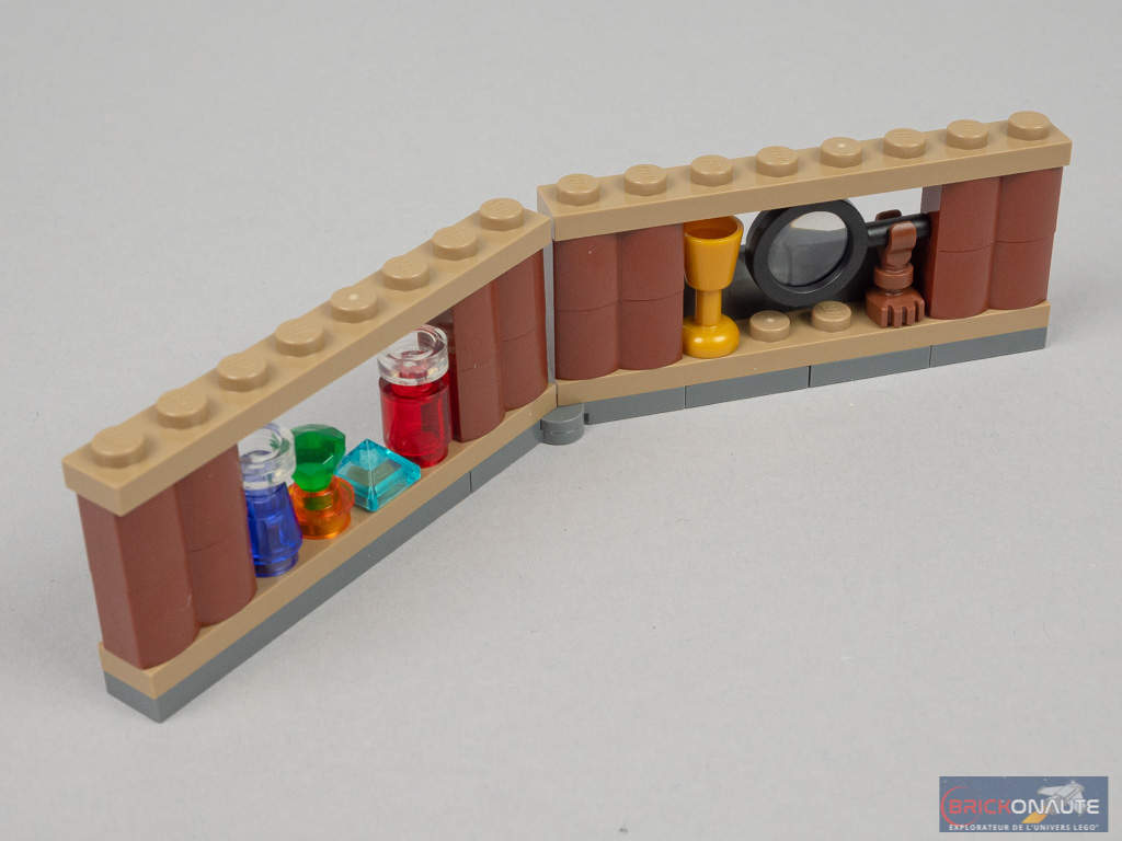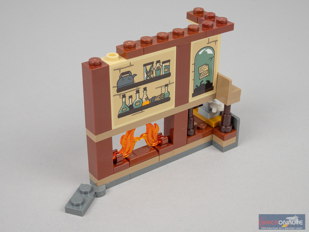 Du côté des minifigs, on appréciera surtout la minifig inédite (pour le moment), et superbement réalisée, du professeur Maugrey. Elle est d’ailleurs accompagnée d’une figurine « trophée » (microfig) de ce même personnage, qu’on mettra dans le coffre où il s’est fait piéger. Pour suivre les cours, LEGO nous propose Hermione et Neville, dans deux tenues différentes.