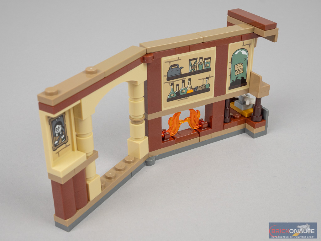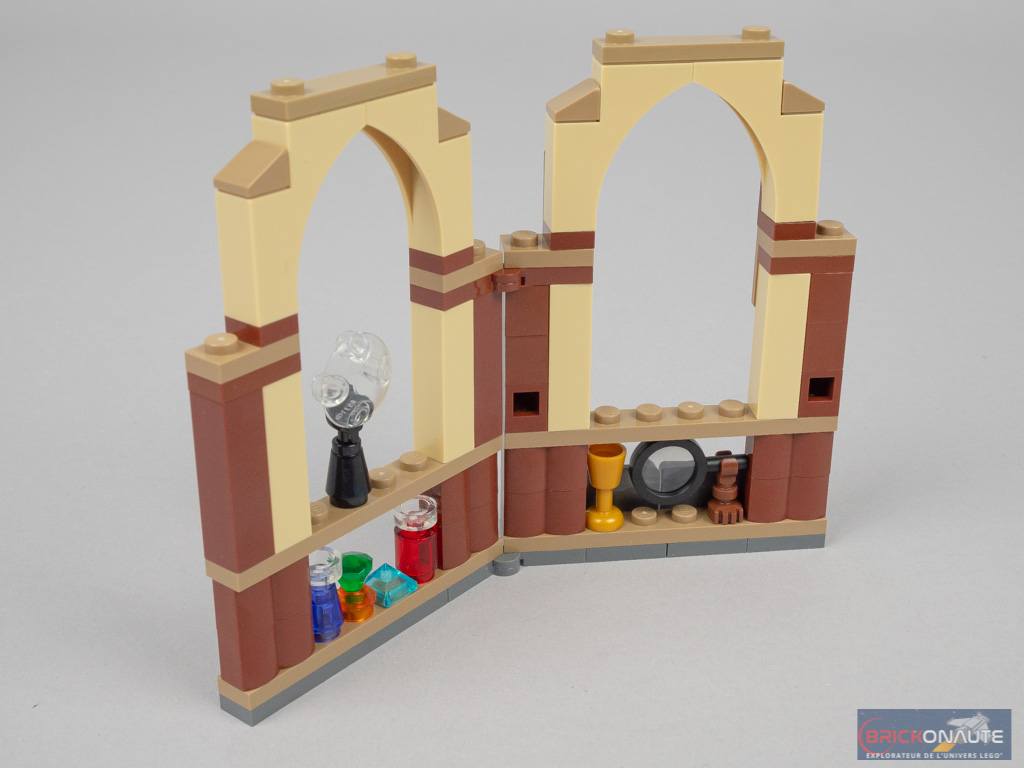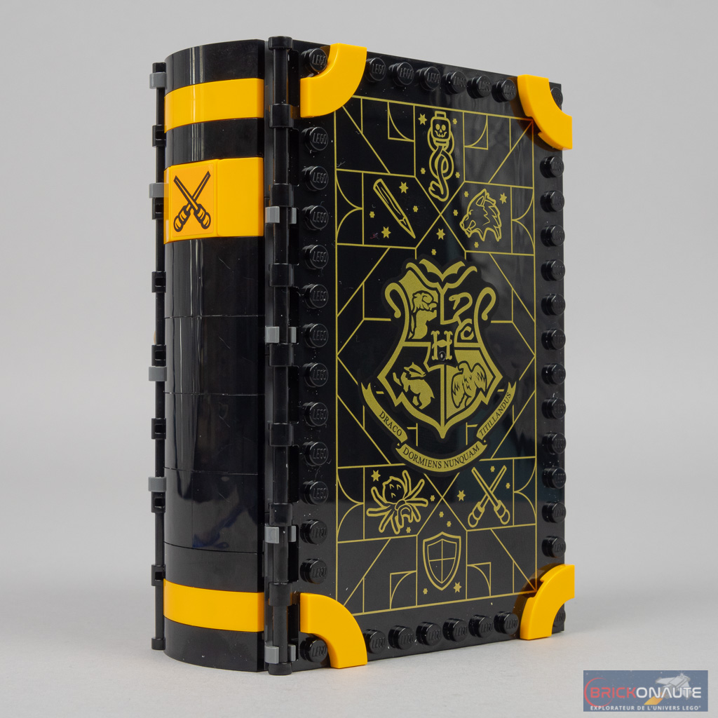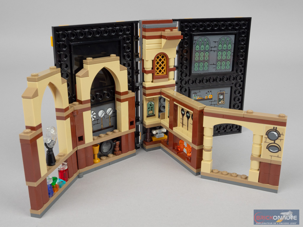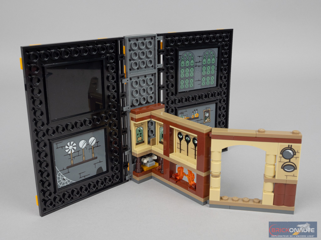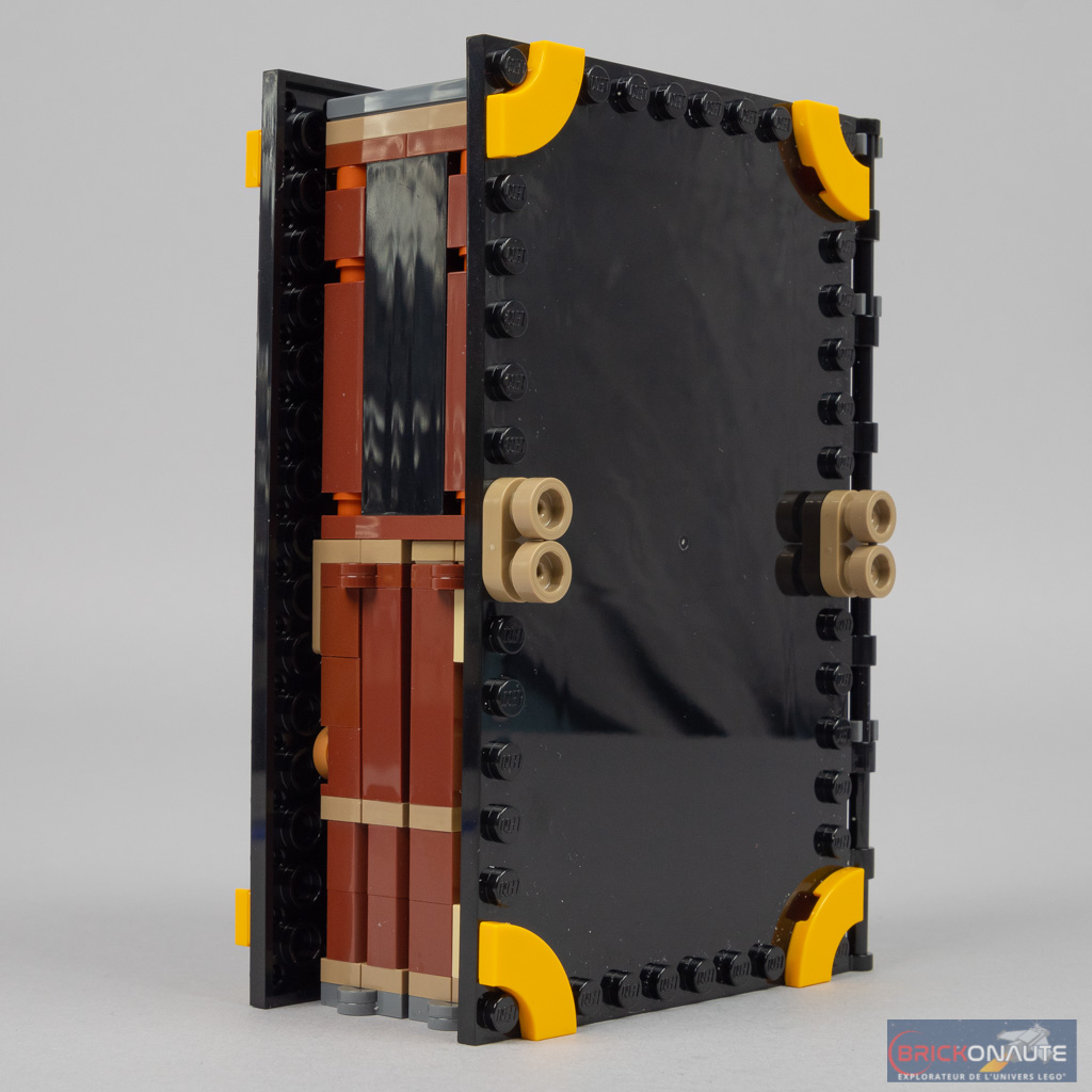 Côté extérieur, les petites pièces couleur dark tan que vous pouvez voir un peu plus haut servent à connecter différents livres entre eux, pour former une scène de jeu plus imposante. La jouabilité est ici clairement au rendez-vous avec une bonne dose d’accessoires permettant de reproduire quelques scènes de la saga Harry Potter, et plus précisément celle du cours de Défense contre les Forces du Mal vue dans Harry Potter et la Coupe de Feu.