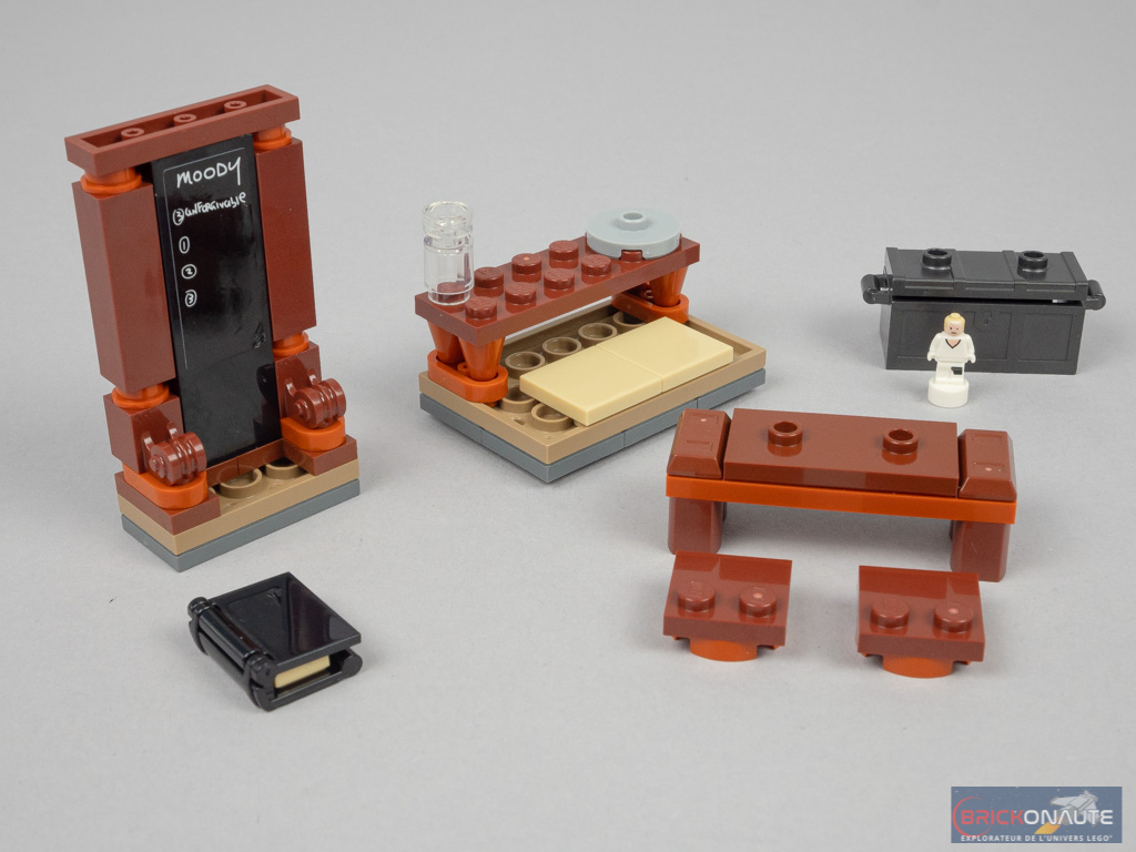 Il ne reste qu’à construire tous les accessoires pour meubler l’ensemble : un coffre (contenant un mini Maugrey – après qu’il ait été enfermé là par Barty), un bureau et un tableau noir décoré d’un autocollant reprenant les inscriptions vues dans le film (« Moody » & « Unforgiveable »). La table de classe et ses deux tabourets, ainsi que le petits livres ont été assemblés avant le livre lui-même.