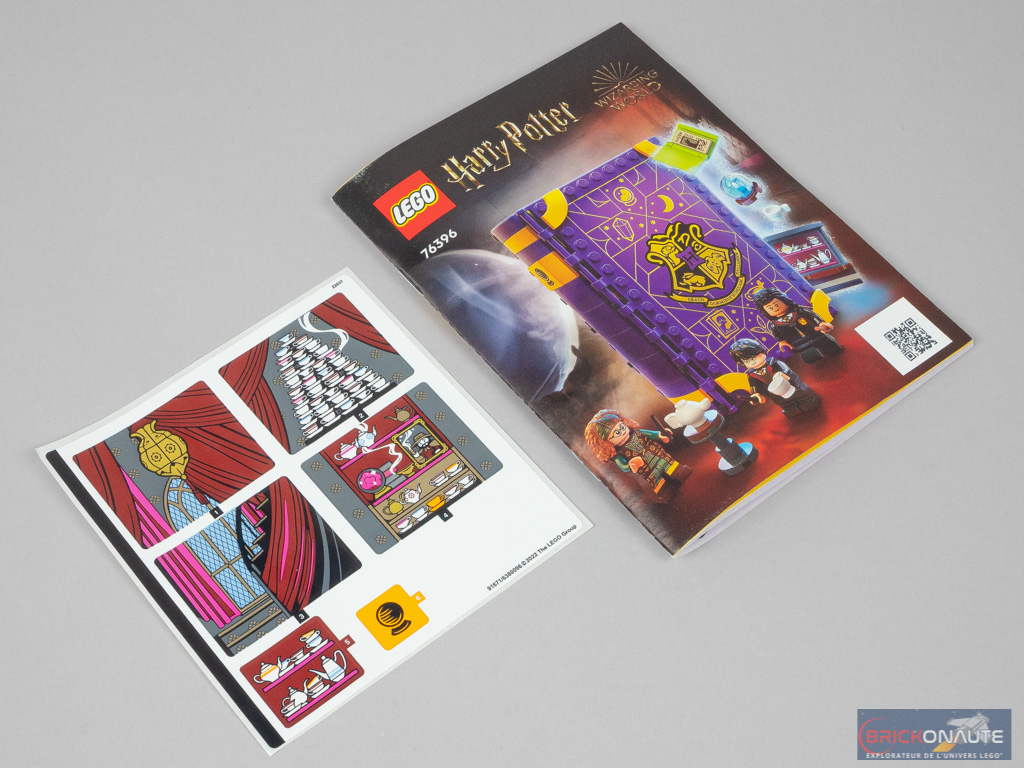 Dans la boîte, nous trouvons 2 sachets de pièces numérotés, les deux couvertures violettes du livre, une plate de 2×16 tenons, une planche de 6 autocollants et la notice d’instructions (84 pages pour 77 étapes).