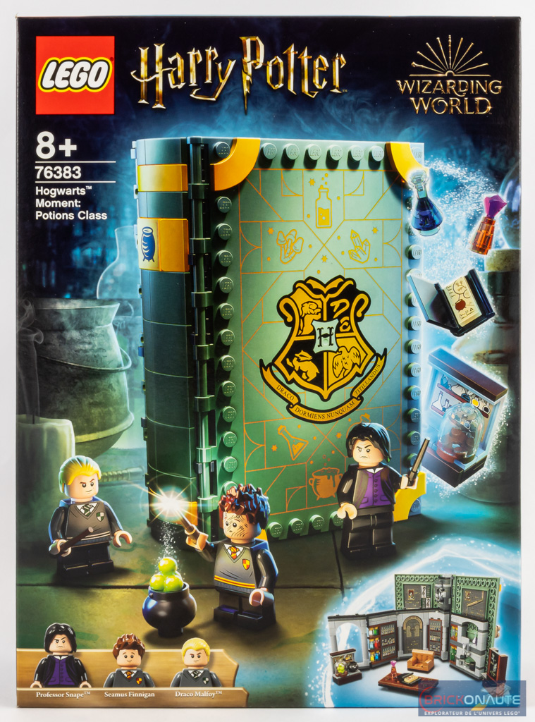 On retrouve le format dont je vous parlais hier avec le set 76382 Hogwarts Moment: Transfiguration Class : sur la face avant, le livre fermé et debout, avec les 3 minifigs mises en scène et quelques accessoires qui s’échappent du livre. Au dos, le livre est déployé et son intérieur dévoilé. Drago et Seamus sont de chaque côté de la table, en train de s’exercer sous l’oeil attentif du professeur Rogue.