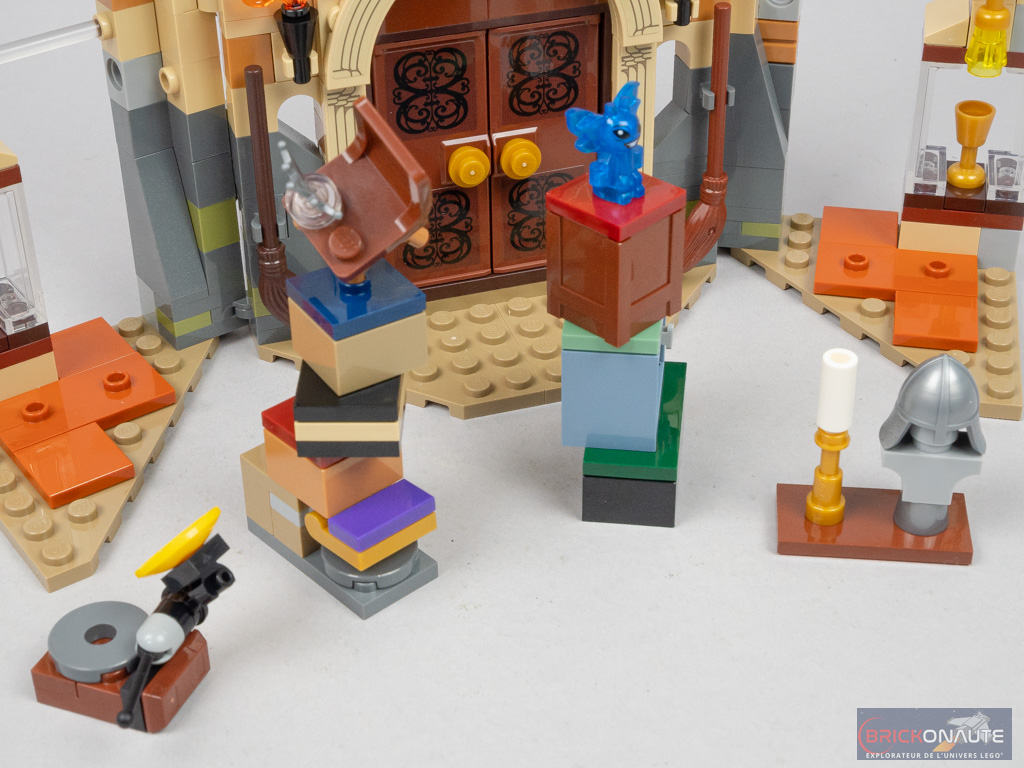 Côté jouabilité, on appréciera évidemment la principale fonctionnalité du set : les deux pans de murs qui coulissent pour dévoiler la porte de la Salle sur Demande. La grande quantité d’accessoires est également un très bon point et permettra de rejouer bon nombre de scènes visibles dans la saga Harry Potter, et pas seulement dans le dernier film dont ce set s’inspire si on en juge par les tenues et la taille des minifigs.