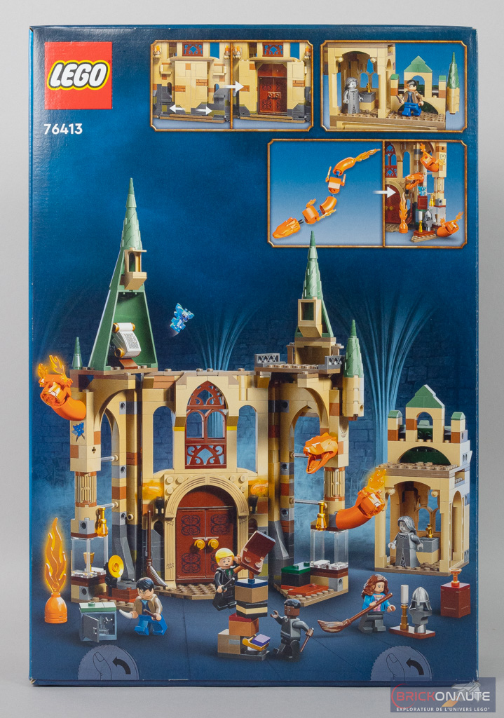 On retrouve, sur la face avant de la boîte, la présentation habituelle de ces « modules » de Poudlard avec notre modèle présenté de nuit au milieu du château. Les 5 minifigs sont en train de voler autour du bâtiment, et un serpent de feu sort par l’accès principal. Au dos, nous découvrons le verso de l’ensemble et l’aménagement intérieur des pièces, ainsi que quelques vignettes pour les principaux détails et fonctionnalités.