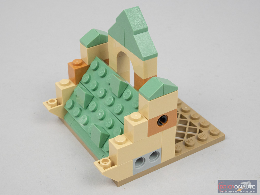 Côté design, l’ensemble est dans la lignée de ce que LEGO nous a proposé jusqu’ici dans cette « collection » d’éléments modulaires : toits verts et murs tan, avec quelques accents gris, medium nougat et olive green en partie basse. La construction est plutôt divertissante et variée, l’intérêt résidant surtout dans la conception de l’ensemble en 3 parties articulées par des charnières. On regrettera malgré tout les trop nombreux autocollants, pas forcément faciles à appliquer (surtout sur la porte…).