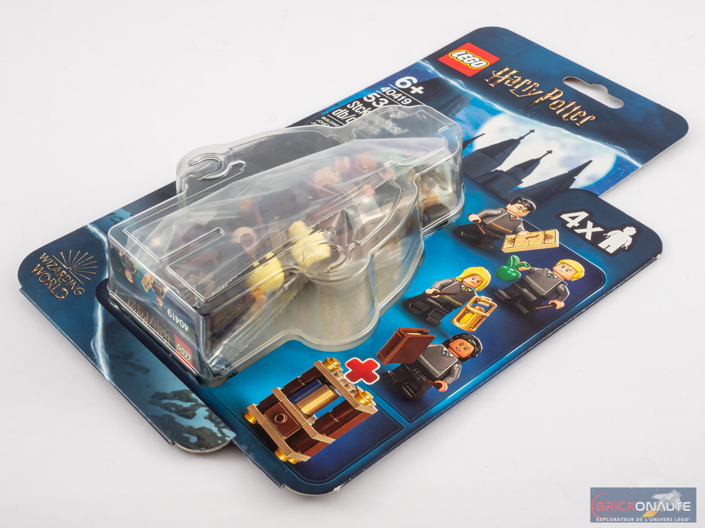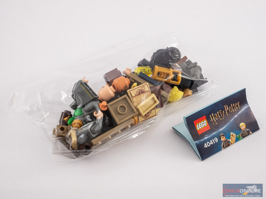 Dans le blister à la forme de minifig, un sachet de pièces standard contient les 53 pièces. On notera parmi celles-ci la présence de la Carte du Maraudeur, tampographiée sur une tile de 2×3 tenons. Cette pièce est exclusive à ce petit set. On retrouve la carte du Maraudeur sous une autre forme (2×2 tenons) dans les mains de George Weasley dans la 2ème série de minifigs à collectionner LEGO Harry Potter.