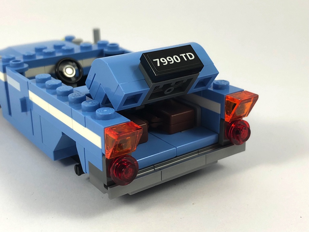 Le premier sachet de pièces nous amène à construire la voiture d’Arthur Weasley, une Ford Anglia couleur medium blue au toit blanc. Harry et Ron « empruntent » la voiture pour se rendre à Poudlard, mais celle-ci finit sa course dans le Saule Cogneur.