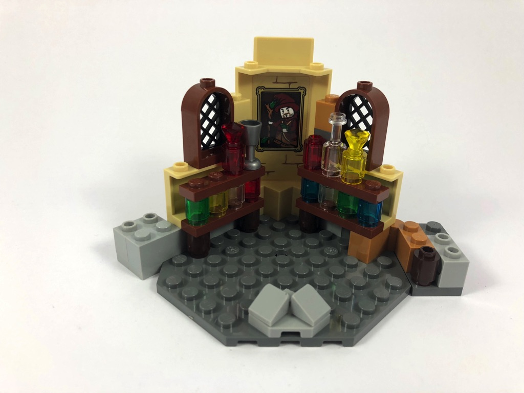 Tout comme la tour, la salle des potions se base sur une plate octogonale. On commence également par quelques rochers, avant d’ajouter une fenêtre et deux pans de murs chacun décoré de deux stickers (des pierres côté extérieur, et des portraits côté intérieur). On passe ensuite à l’aménagement intérieur. 3 tables sont disposées le long des murs, avec des potions de différentes couleurs. On referme ensuite le tout avec deux arches, puis les remparts situés au-dessus. On termine avec une grande table centrale sur laquelle on trouve deux chaudrons et une bougie. On fixe cette salle à la tour centrale, permettant de prolonger le rez-de-chaussée existant et ainsi de créer une grande salle des potions.