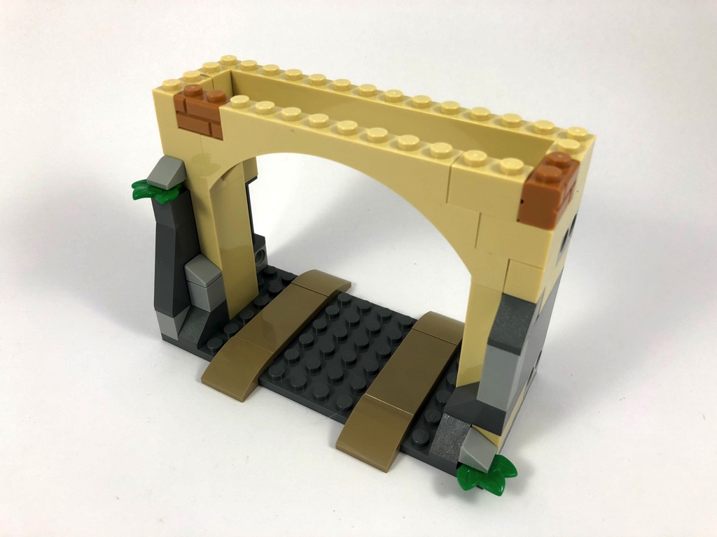 Le porche d’entrée est basé sur une plate de 6 x 14 tenons. après avoir ajouté quelques rochers, on construit les deux pans de murs. Ceux-ci sont reliés entre eux par une grande arche et une brique de 12 tenons, qui supportent les remparts. Quelques créneaux, ainsi qu’une toiture demi-conique texturée terminent cette section. Elle est fixée à la tour par deux pins Technic.