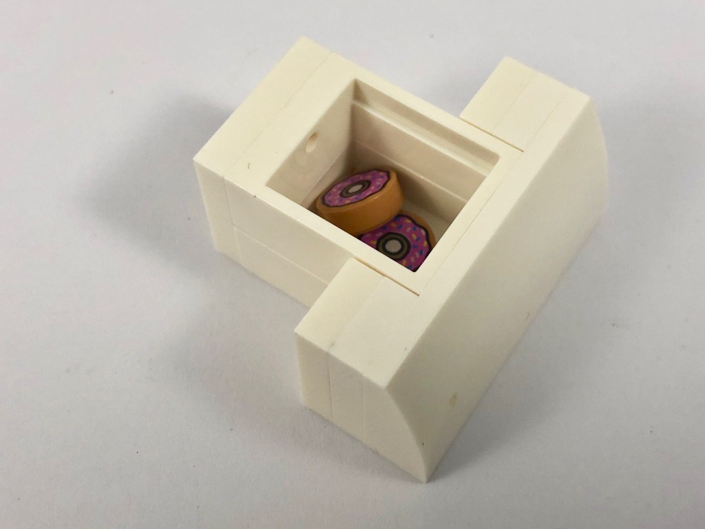Ayant commencé par la tête, on retourne ensuite le personnage pour construire son torse, et là aussi le designer s’est fait plaisir : vous remarquerez sur la photo plus bas que le torse est creux, le reste du ventre étant inséré tel un tiroir dans lequel on trouve (vous l’aurez certainement deviné) deux donuts ! On termine Homer en le plaçant sur son socle d’exposition.