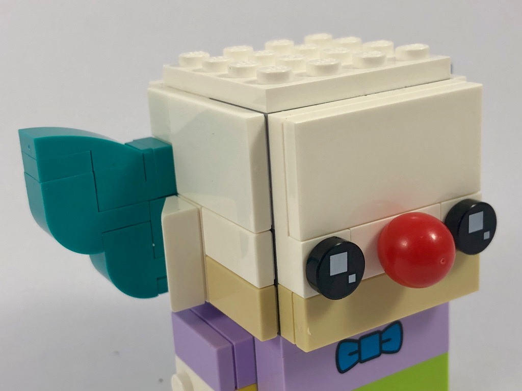 J’étais plus que circonspect lorsque j’ai découvert les premiers visuels de cette boîte, mais j’ai été très agréablement surpris par la construction. Les petits détails invisibles à celui qui n’a pas construit la BrickHeadz d’Homer sont très drôles, et font penser aux bâtiments de la gamme LEGO Creator Expert où bon nombre de détails sont cachés et connus seulement de celui qui construit le modèle. La conception de la chevelure de Krusty est également très intéressante et inventive.