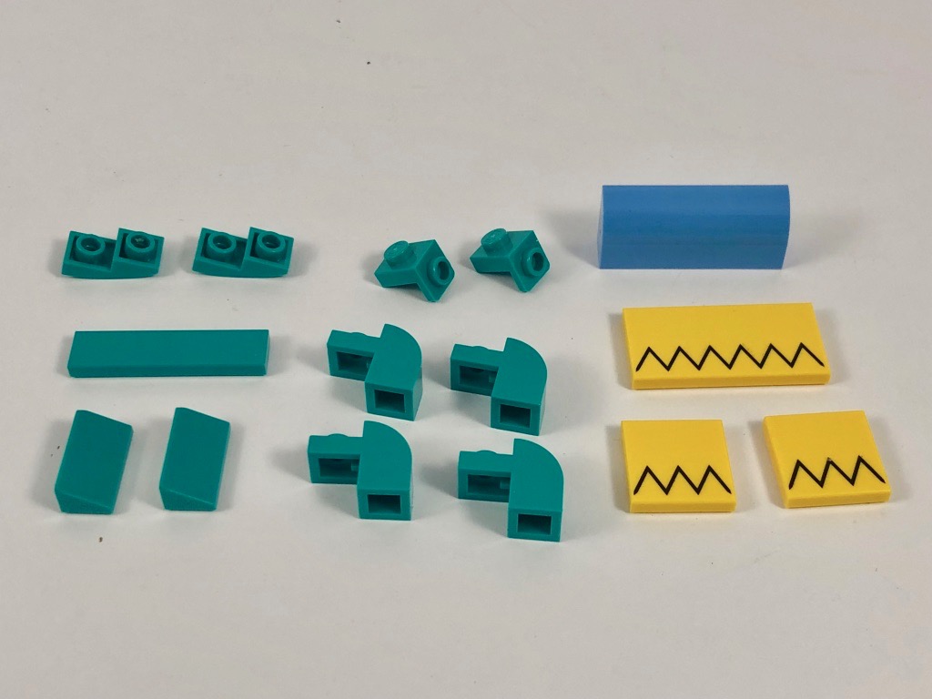 - une jolie variété de pièces en dark turquoise (ou teal) pour la chevelure de Krusty, dont 2 bracket 1×1 inverted, 4 brick 1×1 curved top, 2 doubles cheese slopes, 2 slopes 2×1 inverted ou encore une tile 1×4, toutes ces pièces apparaissant dans 3 sets ou moins.